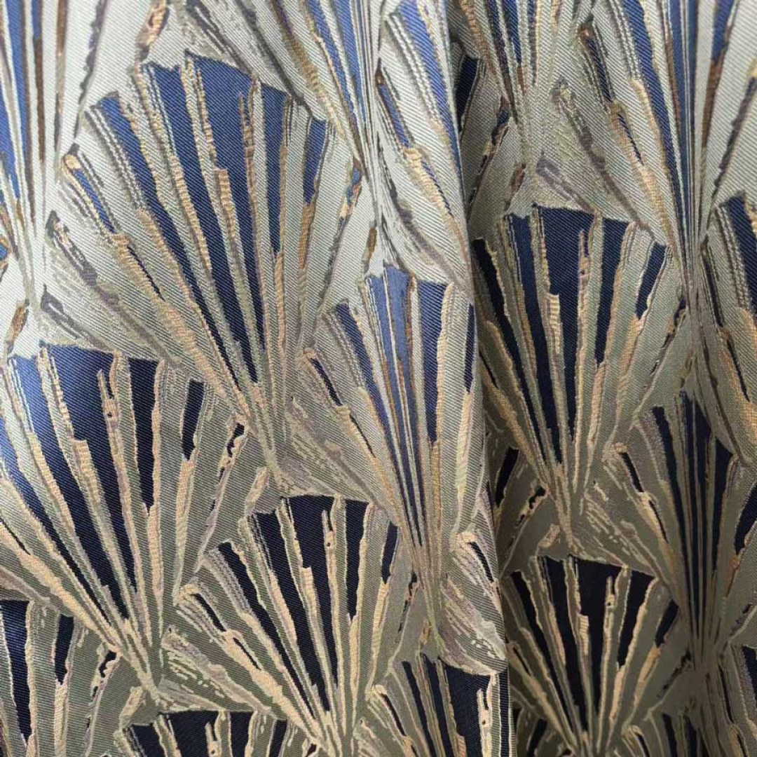 These luxurious curtains unfold a dance of stylized fans, their overlapping arcs in blue and gold creating a harmonious rhythm.