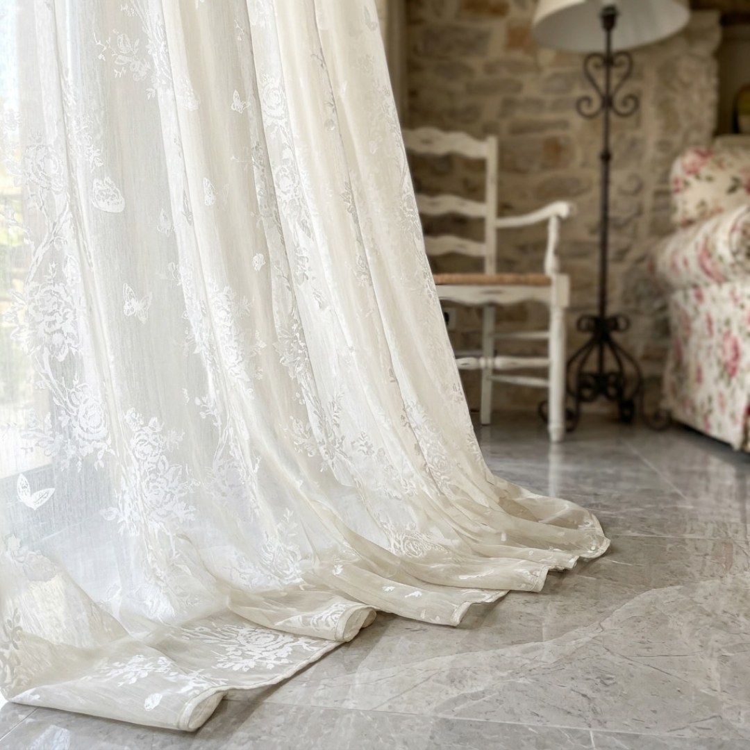 Enchanted Garden Rose & Butterfly Floral Ivory White Sheer Curtain