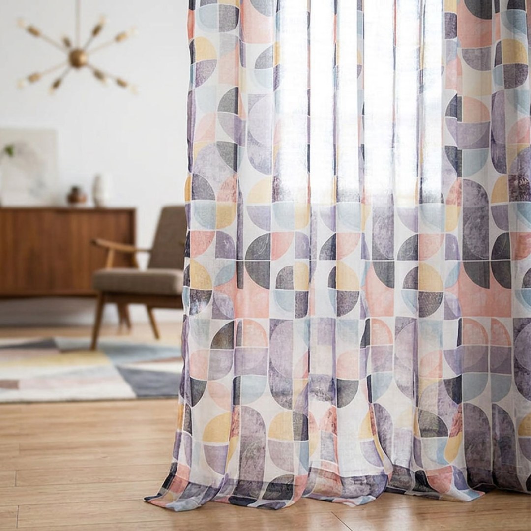 The colors and shapes give your space an undulating texture that ties in with the other elements. Make an impact with these stunning multi colour Mid Century Modern purple pink geometric linen style sheer curtains.