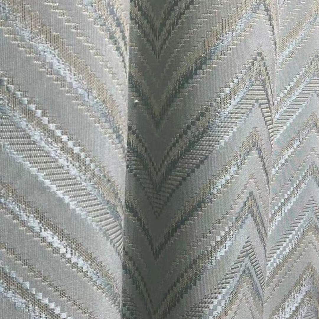 Elevate your space with our Chic Chevron Shimmer drapes. These duck egg blue jacquard curtains feature a bold geometric chevron pattern woven with subtle, light-catching threads. The unique shimmer detail creates a dynamic effect, transforming from a serene matte blue to a radiant glow as the day's light shifts. Perfectly suited for contemporary homes looking for a touch of modern glamour.
