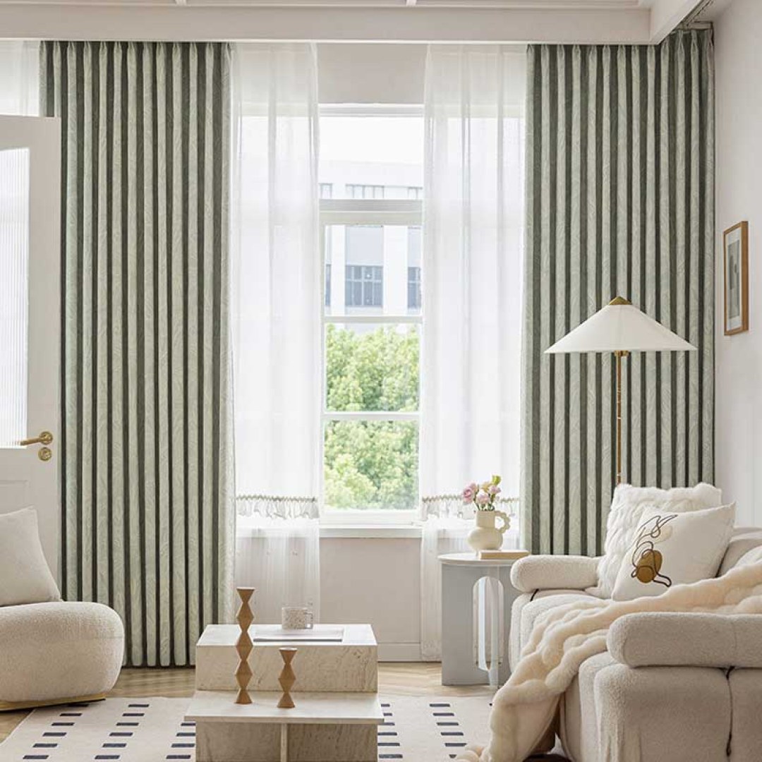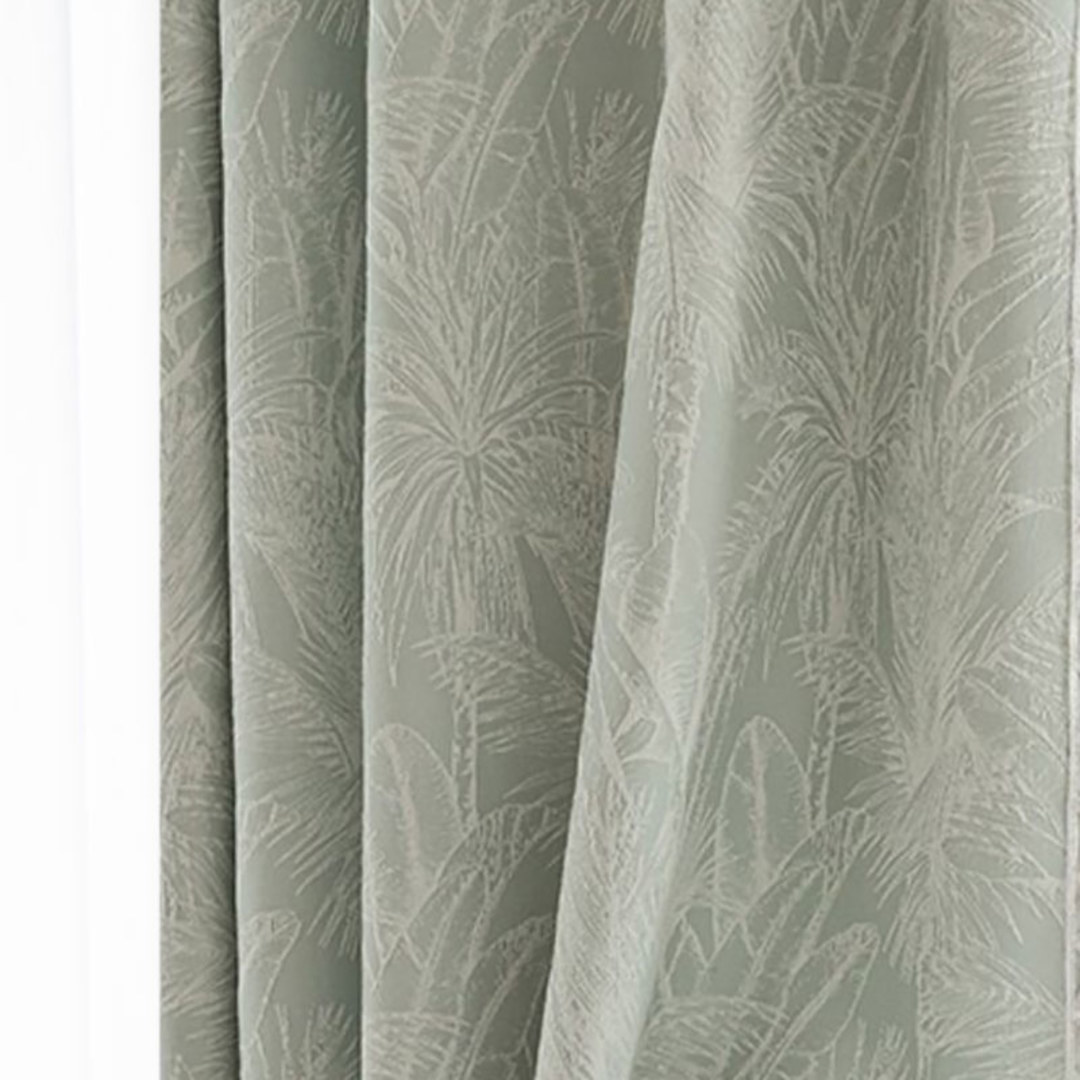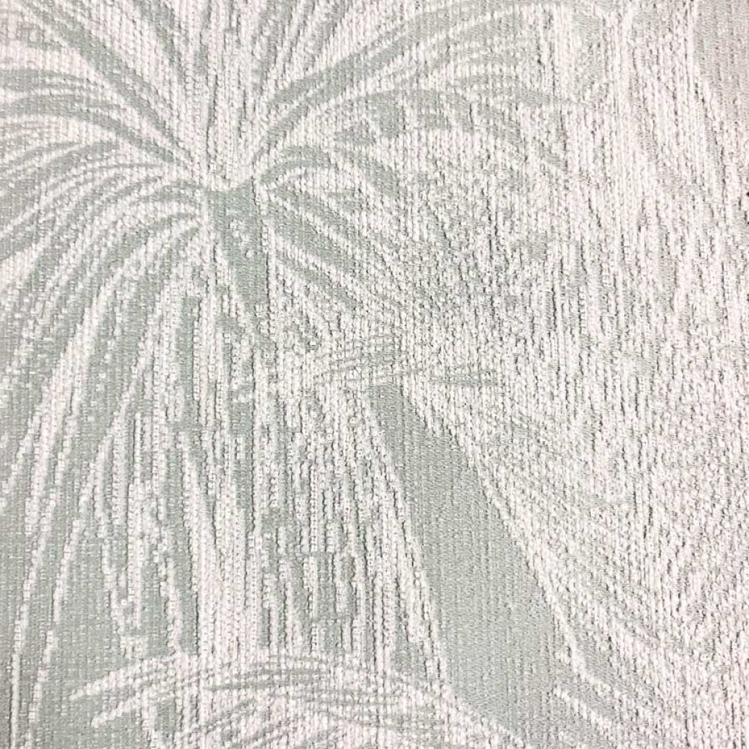 This chenille curtain fabric features a subtle tropical-inspired design with palm fronds and leaves woven into a textured jacquard pattern. The soft green tone is complemented by a raised white design, creating a sophisticated and calming look suitable for a variety of interior styles. The fabric is durable, making it ideal for window treatments, adding both style and a touch of nature to any space.