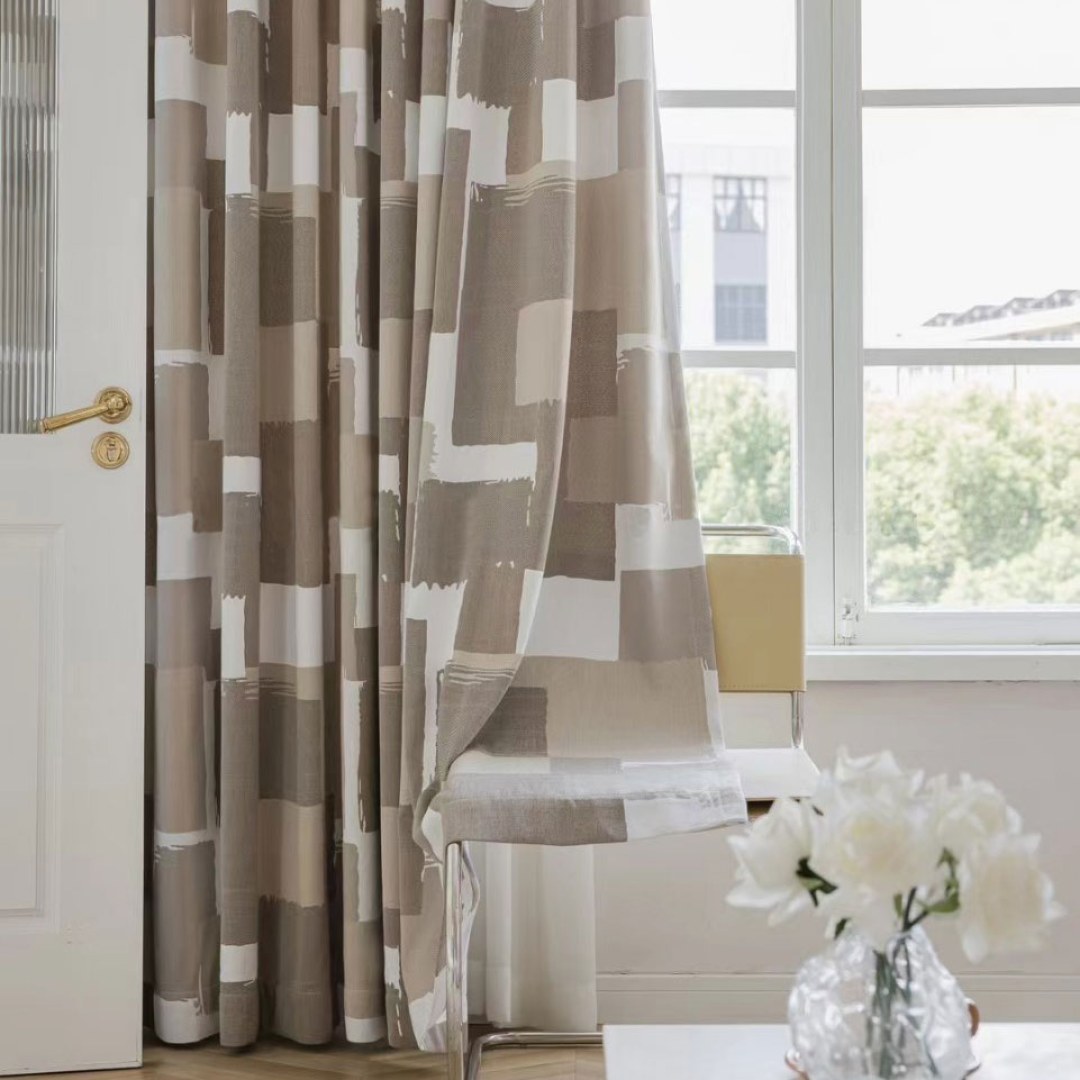 Urban Grid Monochrome Mocha Cream and White Chenille Geometric Curtain
