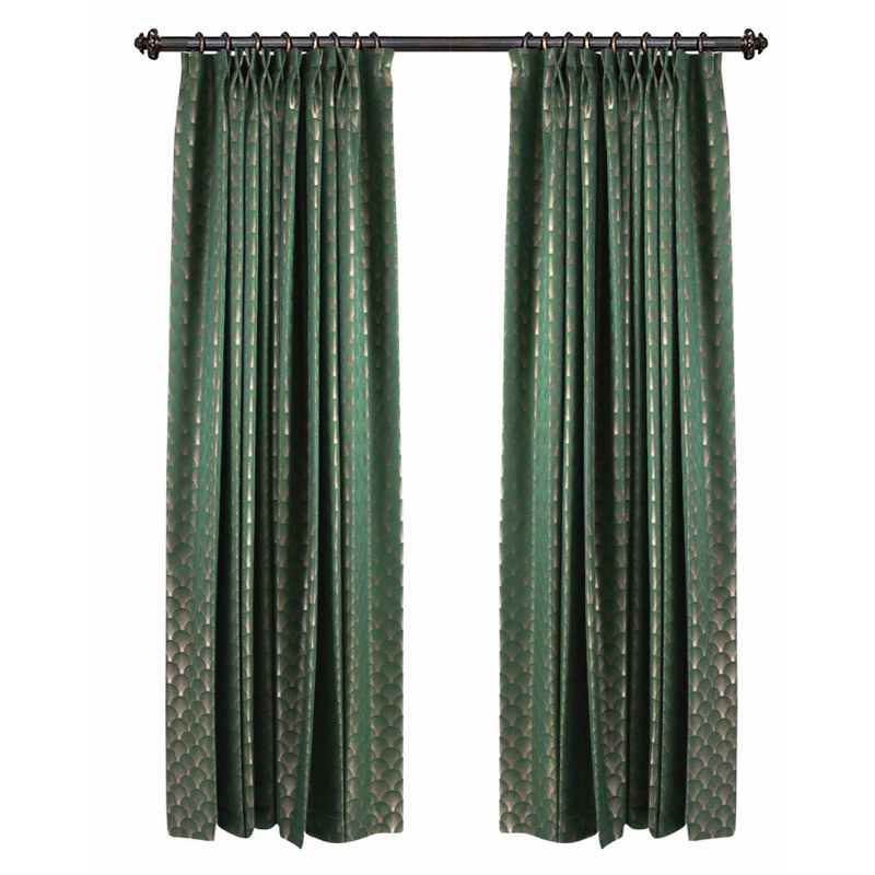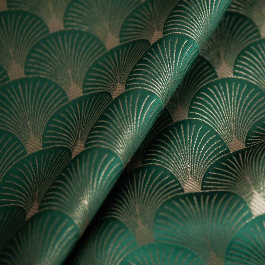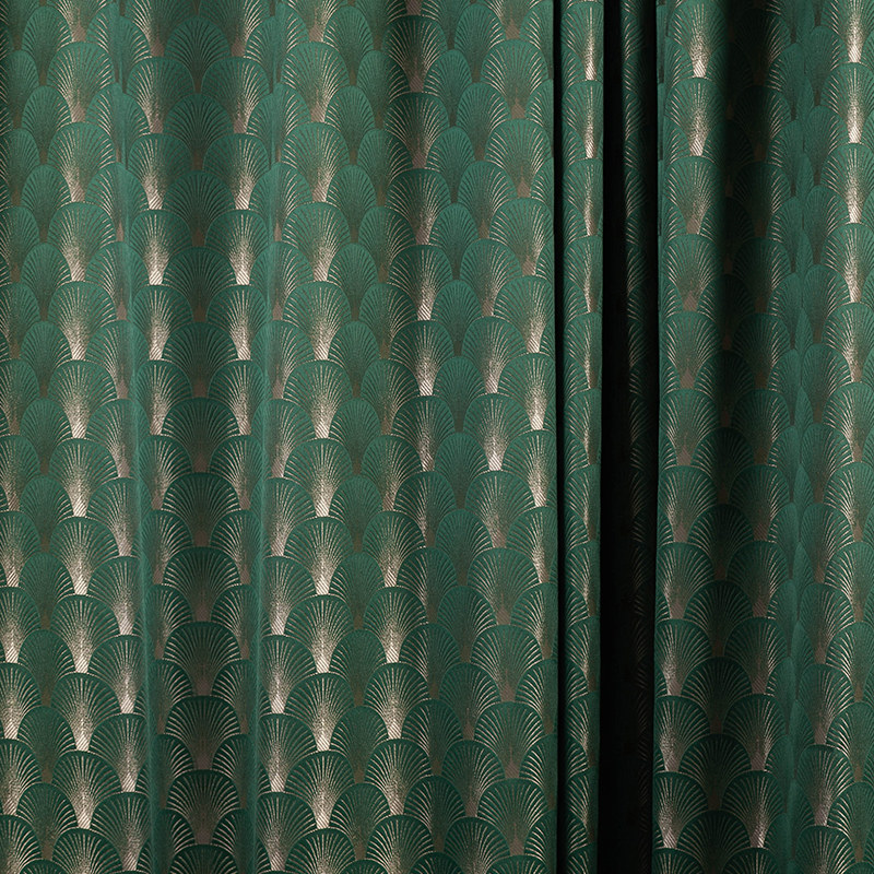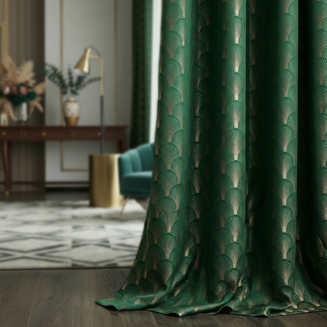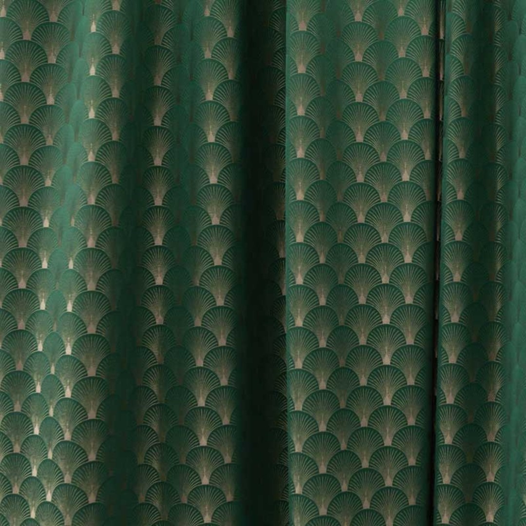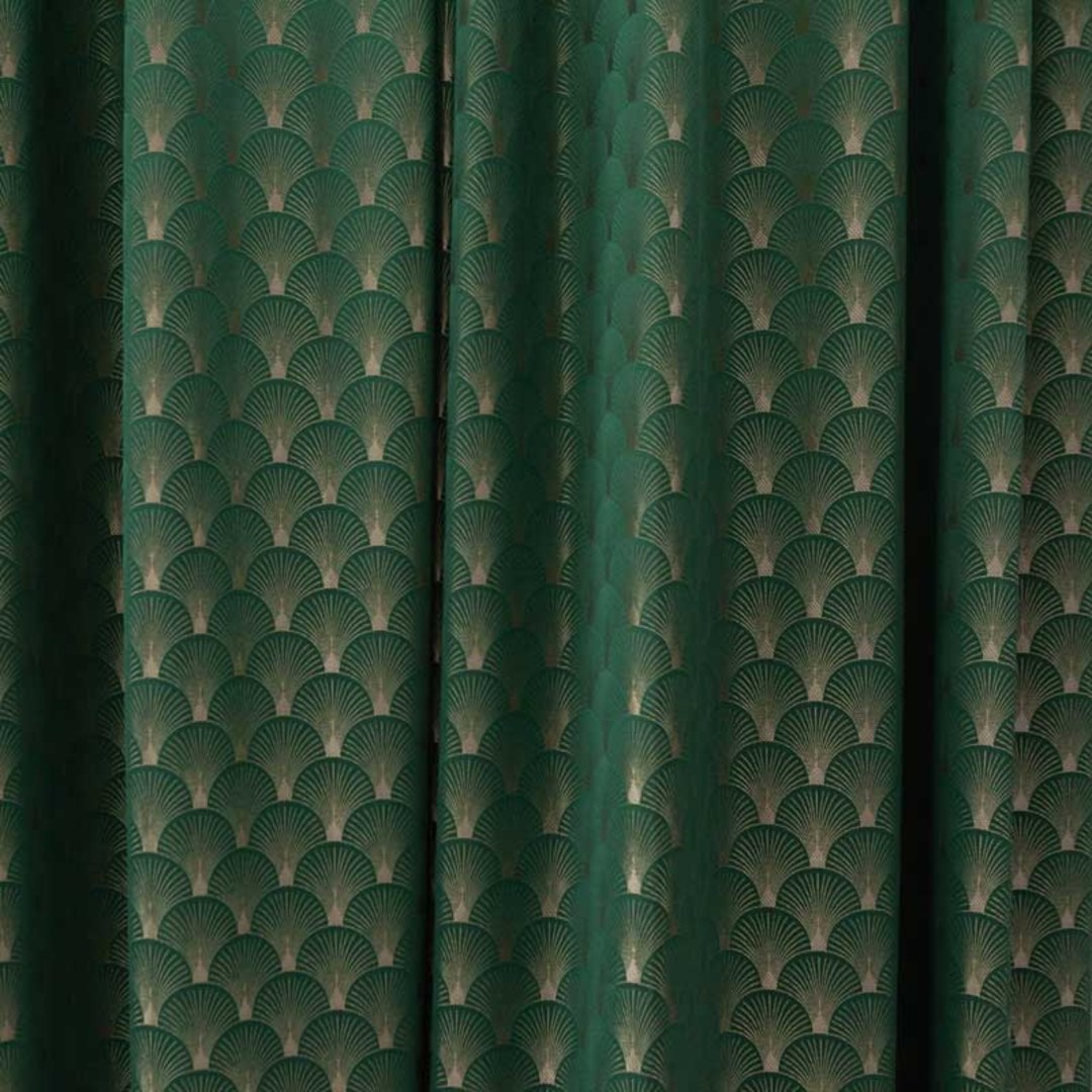 Diese klassischen Art-Déco Muschel gemusterte dunkelgrünen und goldenen Vorhänge werden jeden Raum Ihrer Wahl ergänzen und als auffälliges Dekorationselement dienen.