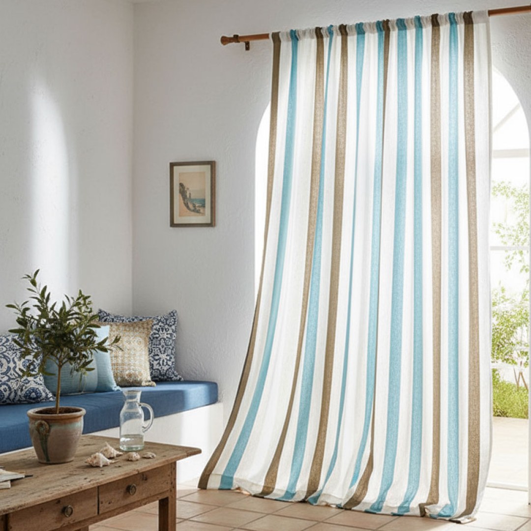 Die Wahl eines gemusterten Vorhangs ist eine großartige Möglichkeit, Interesse zu wecken und Ihre Persönlichkeit auszudrücken. Setzen Sie ein Statement mit einem auffälligen, künstlerischen Streifenmuster-Vorhang. Die wunderschönen Türkisblau- und Sandtöne bringen perfekt die mediterrane Atmosphäre in den Raum. Unsere maßgefertigten Vorhänge werden nach Ihren genauen Anforderungen gefertigt und sind in verschiedenen Aufhängungsarten erhältlich – Ösen, Schlaufen, Faltenband, Doppelstich, Kräuselband oder Hohlsaum. Bestellen Sie passende Gardinenbänder und Kissen, um das gesamte Raumkonzept zu unterstreichen. Entdecken Sie, wie gestreifte Vorhänge jeden Raum aufwerten können.