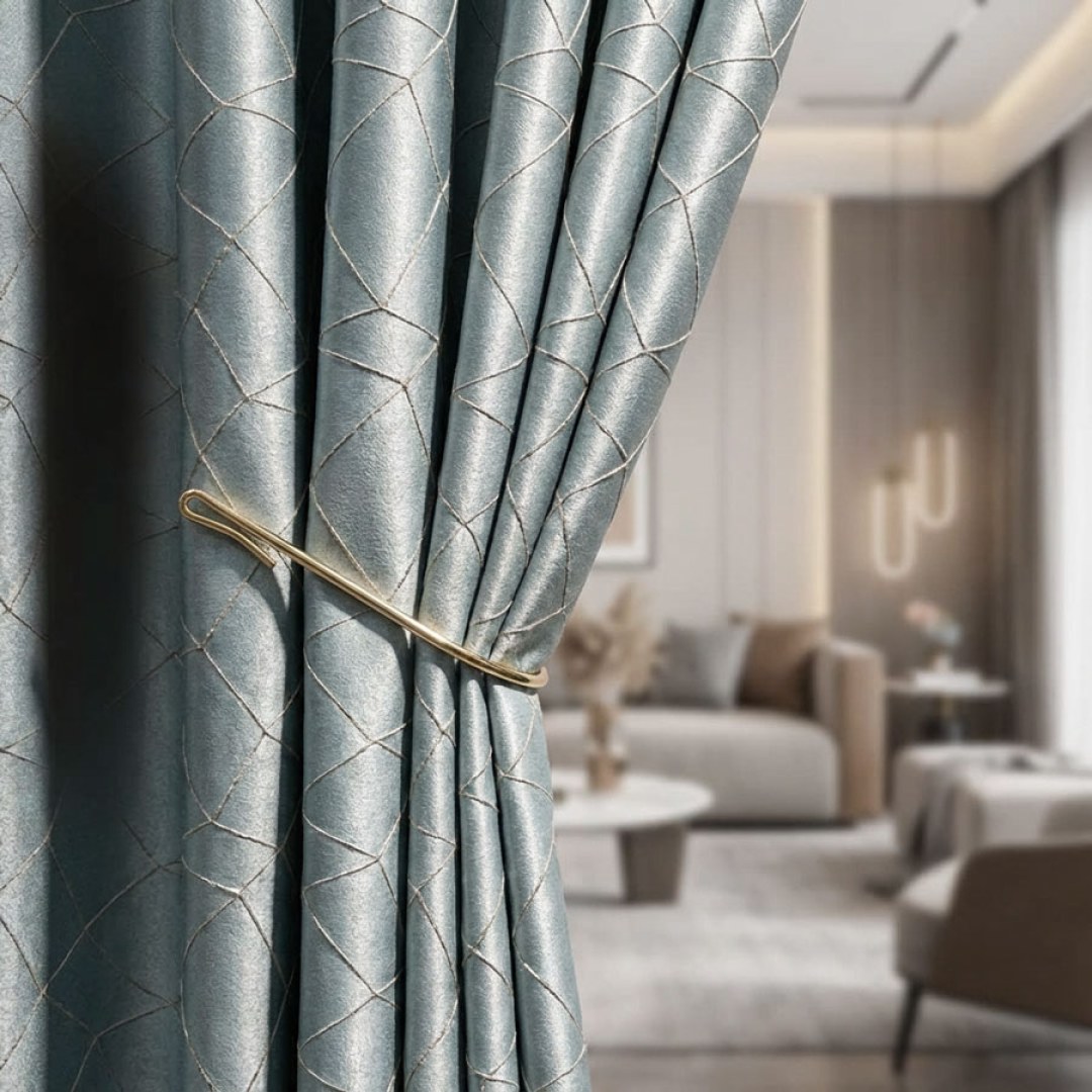 Erhalten Sie einen mutigen neuen Look mit diesen luxuriösen 3D Jacquard-Vorhängen in Enteneiblau mit geometrischem Muster. Unsere maßgefertigten Vorhänge werden genau nach Ihren Wünschen zugeschnitten und sind in verschiedenen Aufhängungsarten erhältlich – Ösen, Schlaufen, Plissees, Maßplissees, Zwickfalten, umgekehrte Kastenfalten, Stangentasche und Wellenfalten. Entdecken Sie, wie geometrische Vorhänge jeden Raum aufwerten können.