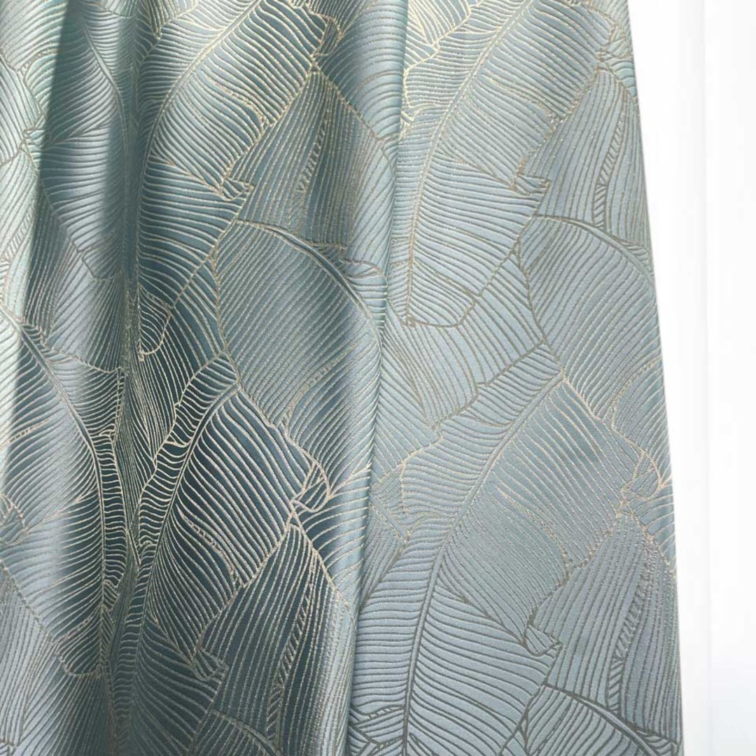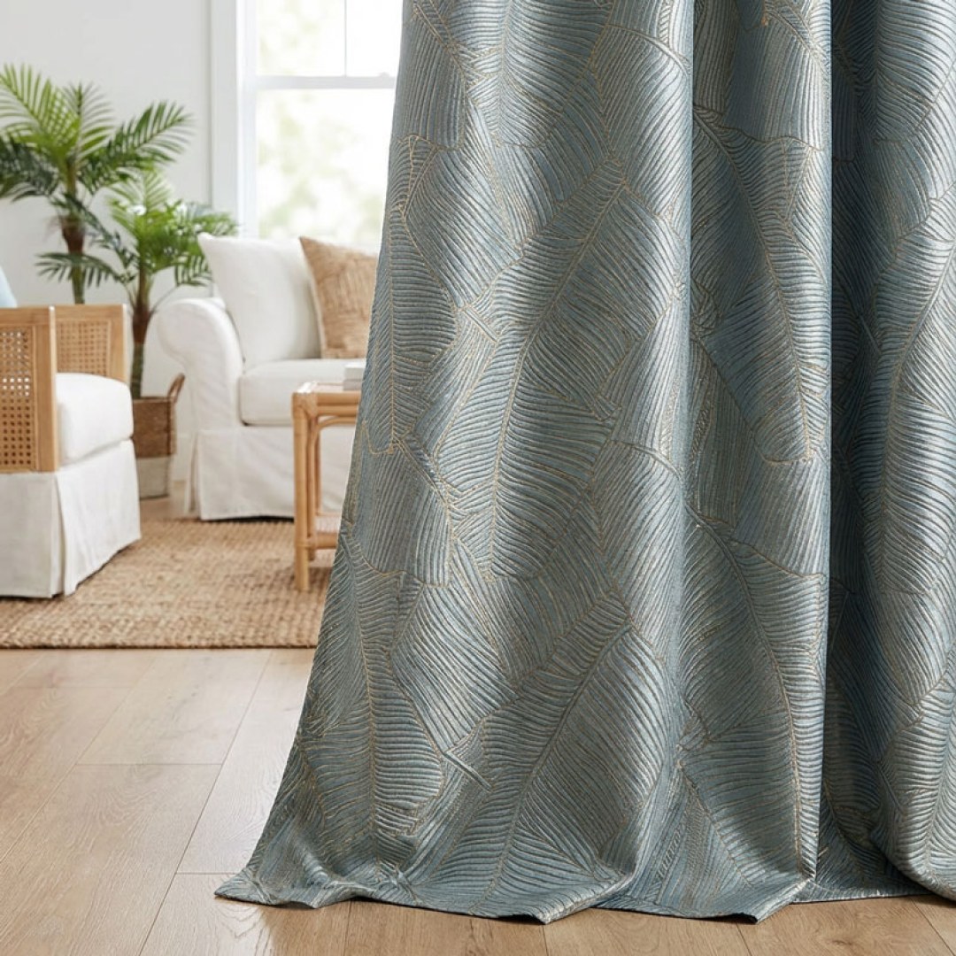 Betreten Sie tropisches Paradies mit diesen atemberaubenden Bananenblatt-Vorhängen. Goldene Details erzeugen ein Lichtfangendes Schimmern, das Ihrem Interieur die perfekte Note verleiht. Unsere maßgefertigten Vorhänge werden sorgfältig nach Ihren individuellen Wünschen gefertigt. Sie sind in einer Vielzahl von Aufhängungsarten erhältlich, die Ihrem Geschmack entsprechen, darunter Schlaufenschlauch, Ösen, Zwickfalten, Maßfalten, umgekehrte Kastenfalten, Schlaufen, Rückenschlaufen, Stangentasche und Wellenvorhänge. Entdecken Sie, wie tropische Vorhänge jeden Raum aufwerten können.