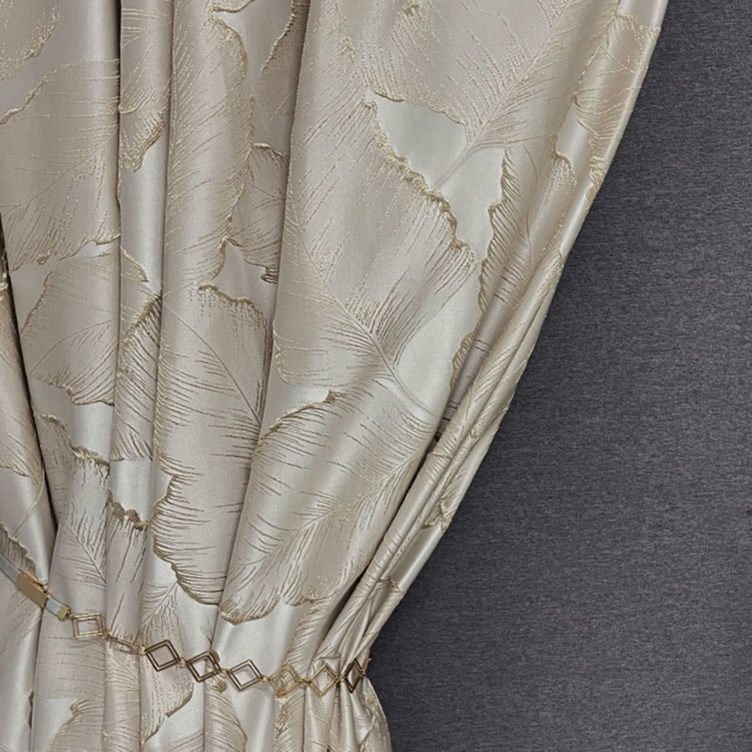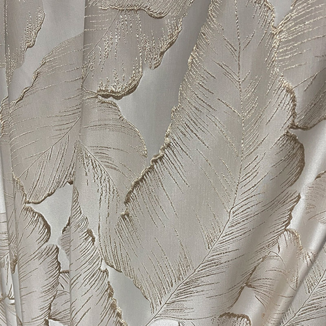 Verleihen Sie Ihrem Raum mit diesen luxuriösen 3D-Jacquard-Tropenblatt-Vorhängen in Silber Fülle und Energie. Die goldenen Details sind schlicht glamourös und ein Blickfang. Unsere maßgefertigten Vorhänge werden genau nach Ihren Wünschen zugeschnitten und sind in verschiedenen Aufhängungsarten erhältlich – Ösen, Schlaufen, Faltenband, Maßgefertigte Falten, Kringelfalten, umgekehrte Kringelfalten, Schlauchtasche und Wellenvorhänge. Bestellen Sie passende Gardinen, Raffbänder und Kissen, um das gesamte Raumambiente zu unterstreichen. Entdecken Sie, wie Tropen-Vorhänge jeden Raum aufwerten können.