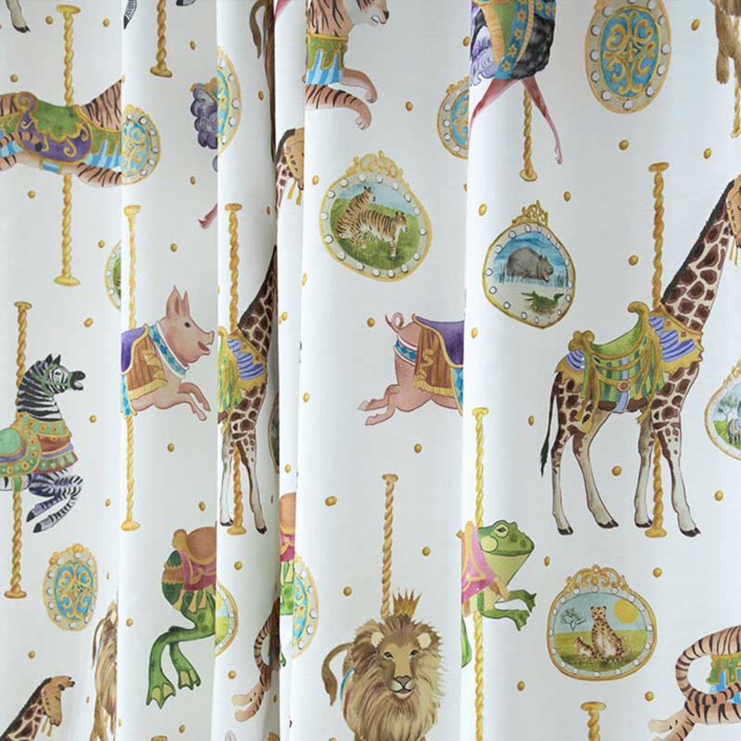 Magische Karussellfahrt mit Giraffe, Löwe, Tiger, Kaninchen, Strauß, Frosch, Zebra und Schweinchen! Diese niedlichen und bezaubernden Tierdruckvorhänge sind die perfekte Ergänzung für das Kinderzimmer oder Spielzimmer. Unsere maßgefertigten Vorhänge werden genau nach Ihren Wünschen angefertigt und sind in verschiedenen Aufhängungsarten erhältlich – Ösen, Schlaufen, Faltenband, Doppelstich, Kräuselband oder Wellenvorhänge. Bestellen Sie passende Gardinenbänder und Kissen, um die gesamte Raumgestaltung zu unterstreichen. Entdecken Sie weitere unserer lustigen Kinderzimmergardinen.