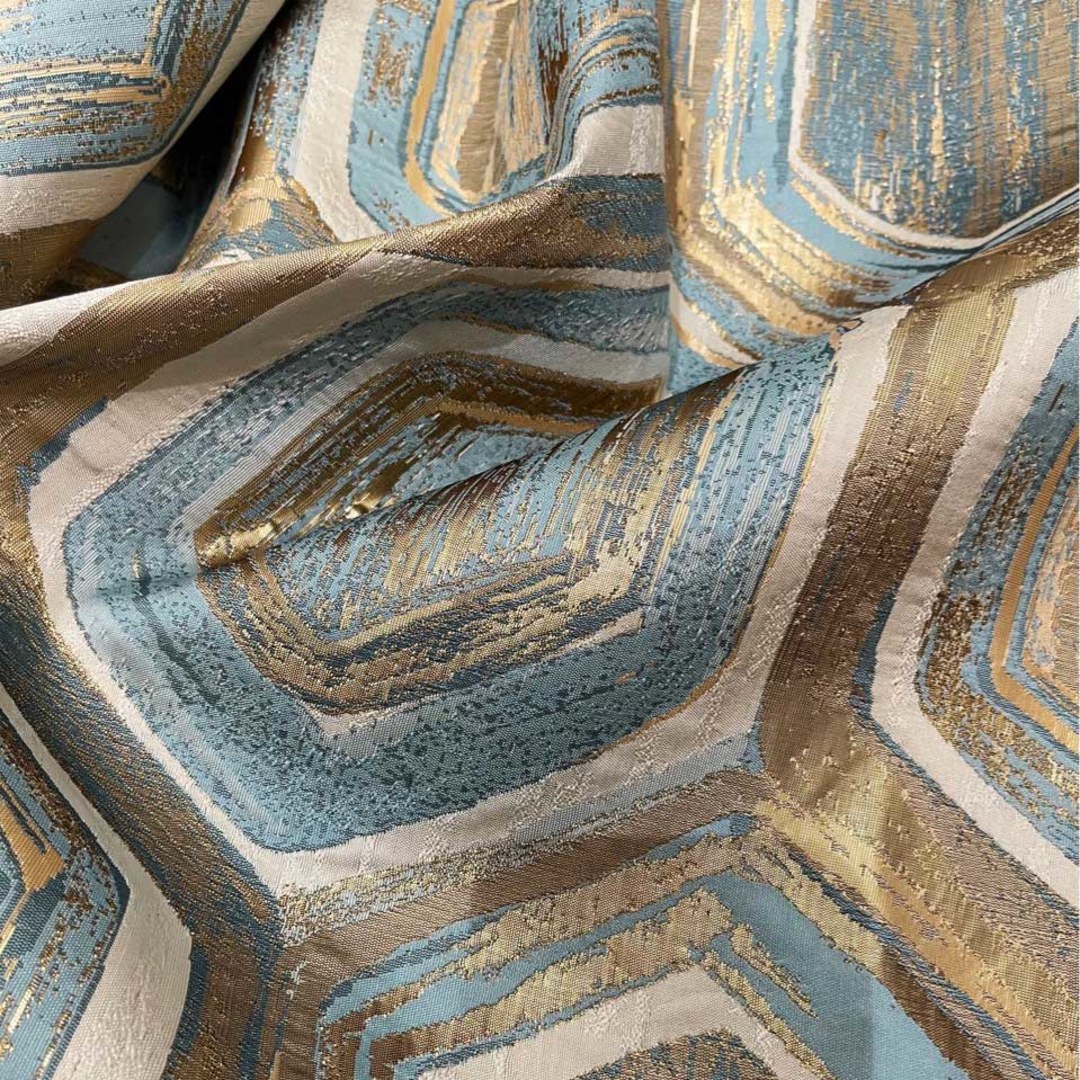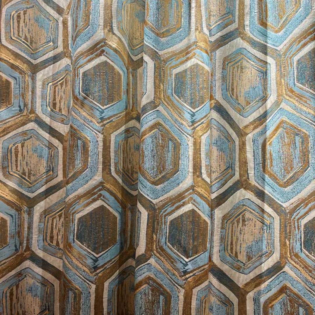 Verleihen Sie Ihren Räumen mit diesen luxuriösen Jacquard-Waben-Geometrie-Vorhängen in Türkisblau und Metallic-Gold ein anspruchsvolles neues Aussehen. Dieses moderne Design ergänzt jeden Raum Ihrer Wahl und dient als auffälliges Dekorationselement.