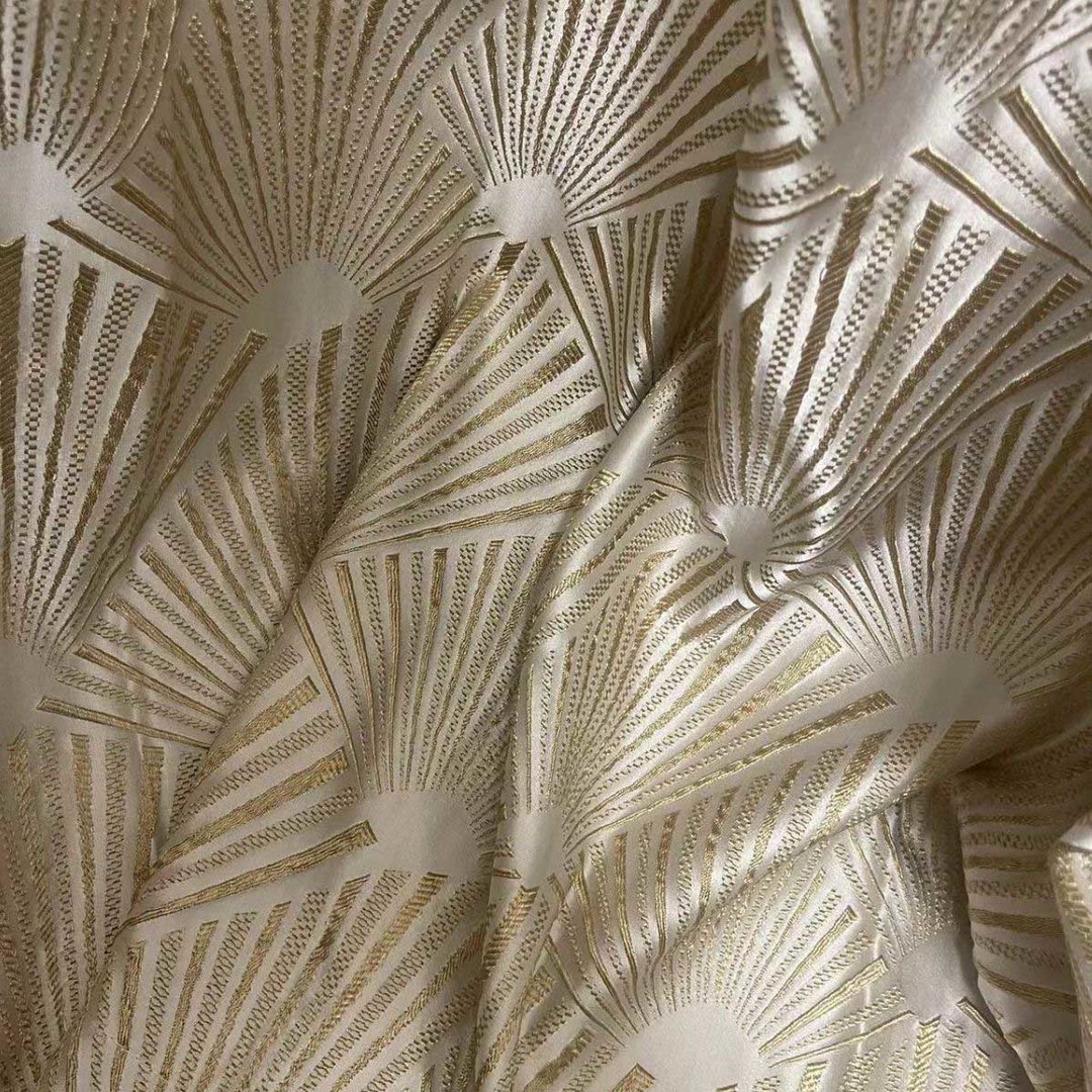 Diese klassischen Art-Déco-Fächer gemusterten cremefarbenen und goldenen 3D-Jacquard-Vorhänge werden jeden Raum Ihrer Wahl ergänzen und als auffälliges Dekorationselement dienen. Unsere maßgefertigten Vorhänge werden sorgfältig nach Ihren spezifischen Wünschen gefertigt. Sie sind in einer Vielzahl von Aufhängungsarten erhältlich, die Ihrem Geschmack entsprechen, darunter Schlaufenschlauch, Ösen, Zwickfalten, Wellenschlauch, umgekehrte Kastenplisse, Schlaufen, Rückenschlaufen, Stangentasche und Wave-Vorhang.Art-Déco-Vorhänge - die einfache Möglichkeit, Glamour und Luxus in Ihr Zuhause zu bringen.