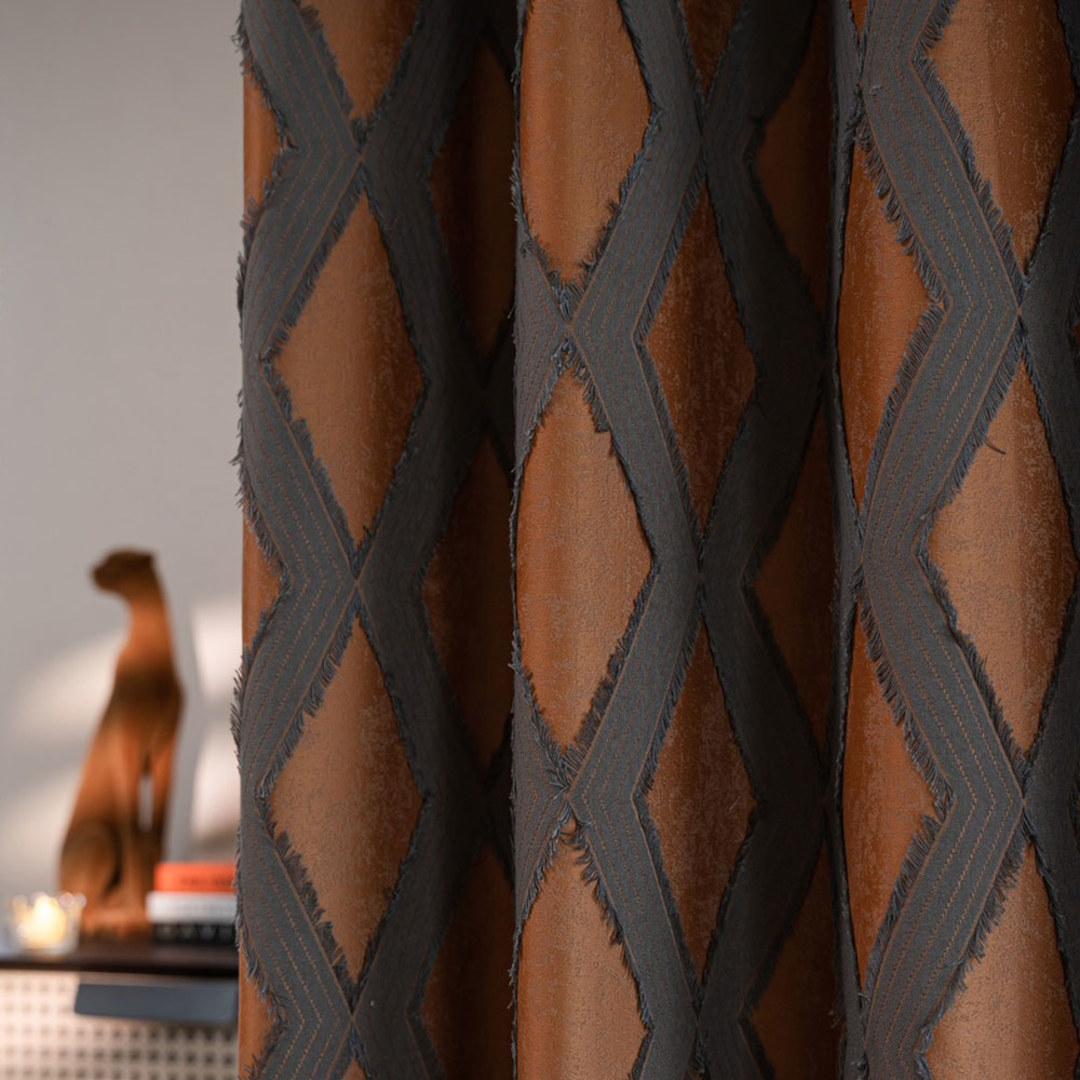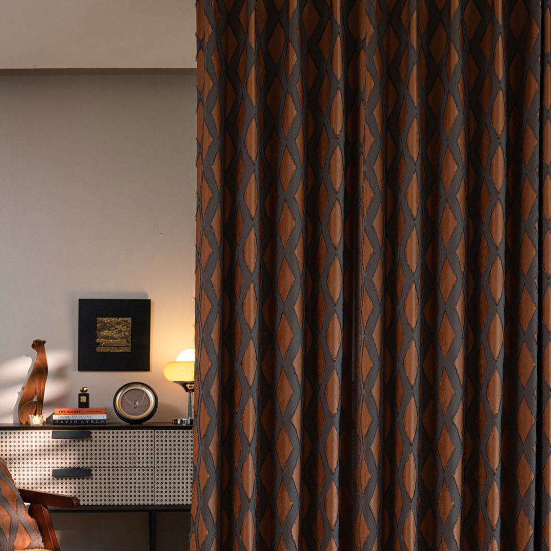 Wir präsentieren unseren Terracotta Diamond Lattice Blackout Vorhang – ein echtes Statement für Ihr Zuhause. Der satte Terracotta-Orange-Ton und das zeitgemäße Rautenmuster verbinden mühelos modernen Stil mit zeitloser Eleganz. Der dezente Fransenabschluss verleiht einen Hauch von Raffinesse und macht ihn zu einer modischen und einzigartigen Ergänzung für Ihren Raum.