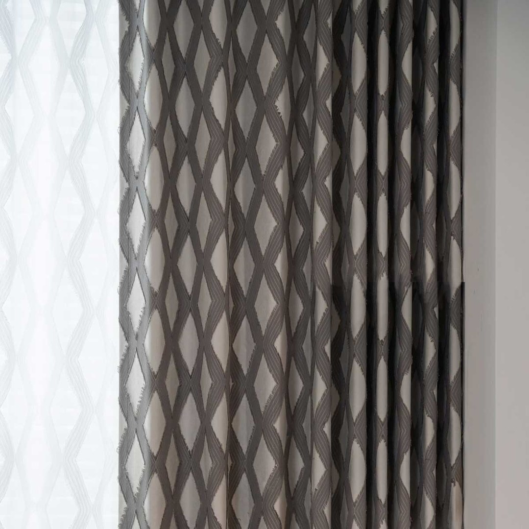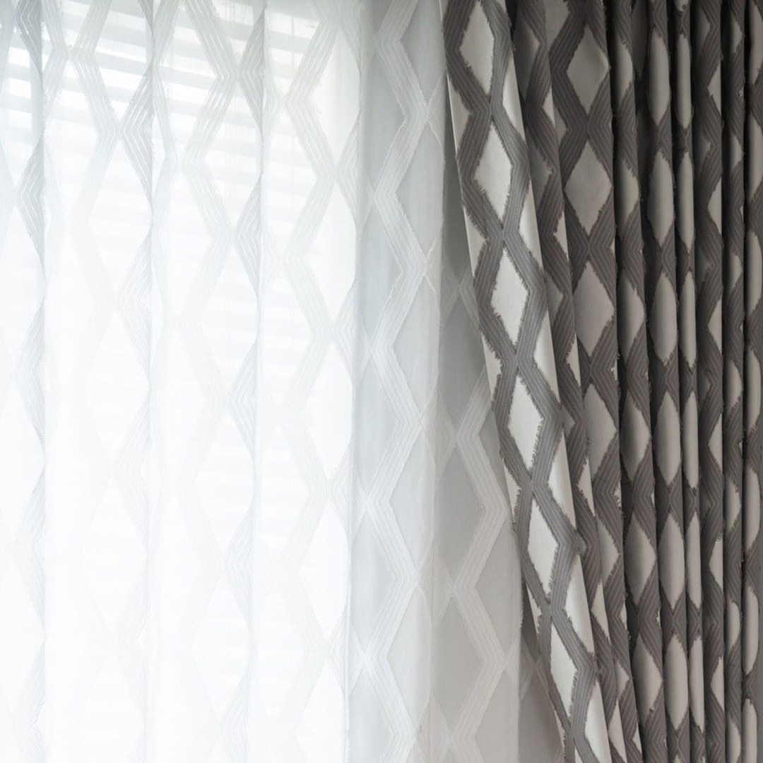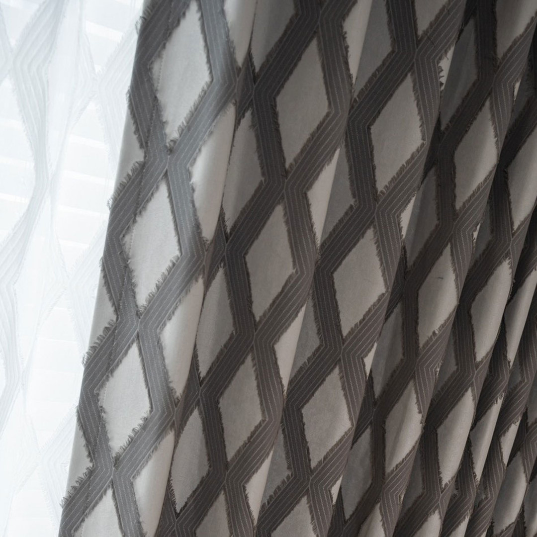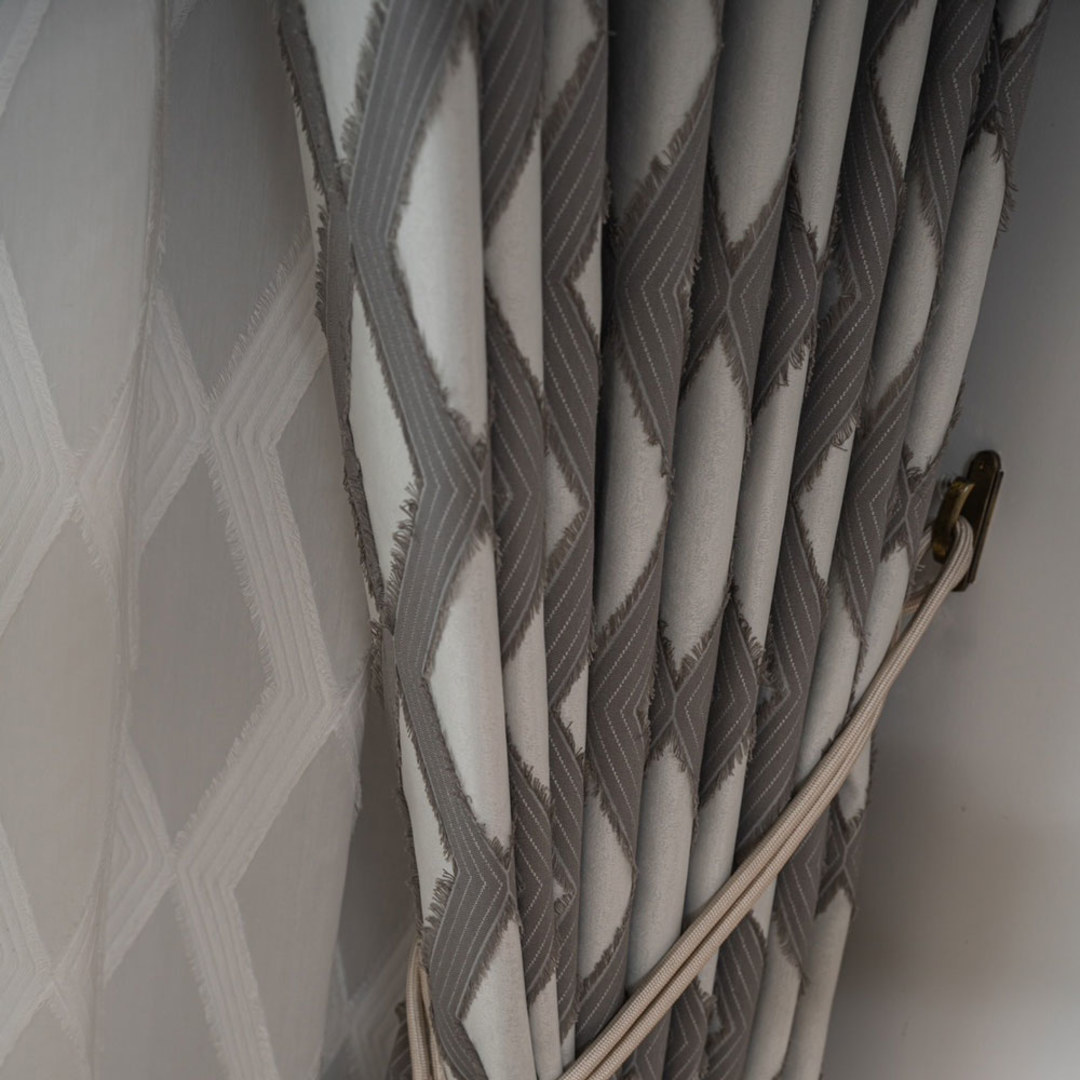 Wir stellen Ihnen unseren grauen Diamond Lattice Blackout-Vorhang vor – ein echtes Statement-Stück für Ihr Zuhause. Der graue Farbton und das zeitgemäße Rautenmuster verbinden modernen Stil mühelos mit zeitloser Eleganz. Der dezente Fransenabschluss verleiht einen Hauch von Raffinesse und macht ihn zu einer modischen und einzigartigen Ergänzung für Ihren Raum. Unsere maßgefertigten Vorhänge werden sorgfältig nach Ihren spezifischen Wünschen gefertigt. Sie sind in einer Vielzahl von Aufhängungsarten erhältlich, die Ihrem Geschmack entsprechen, darunter Schlingen, Ösen, Plissees, maßgefertigte Plissees, umgekehrte Kastenfaltung, Schlaufen, Rückenschlaufen, Schlauchtasche und Wellenvorhang. Bestellen Sie passende Gardinen, Raffbänder und Kissen, um das gesamte Raumambiente zu verbessern. Entdecken Sie, wie geometrische Vorhänge jeden Raum aufwerten können.