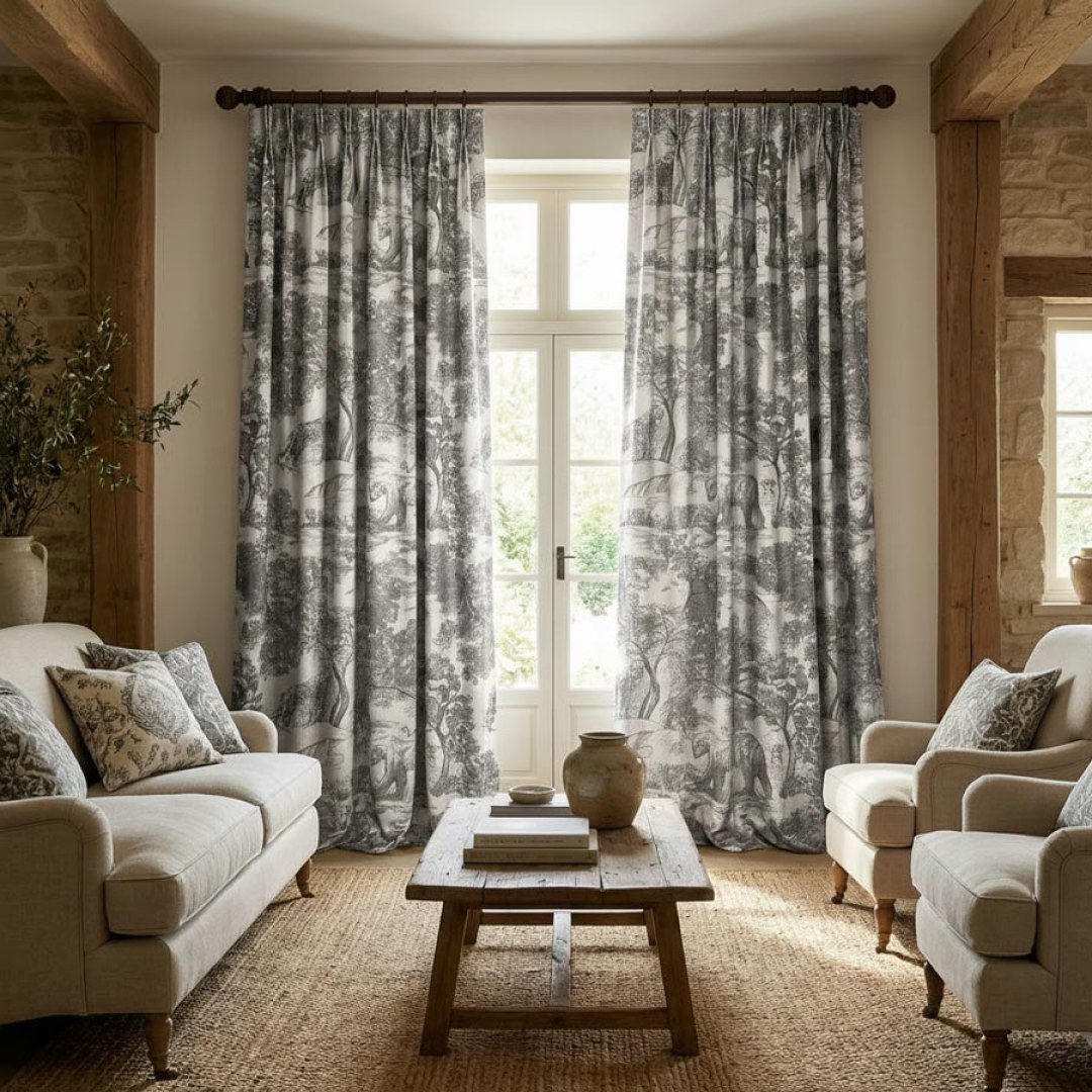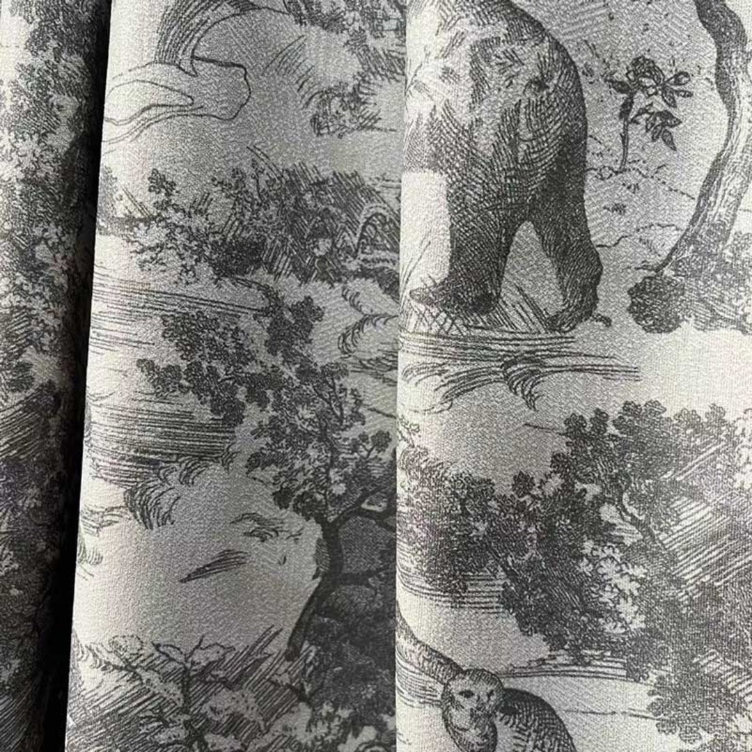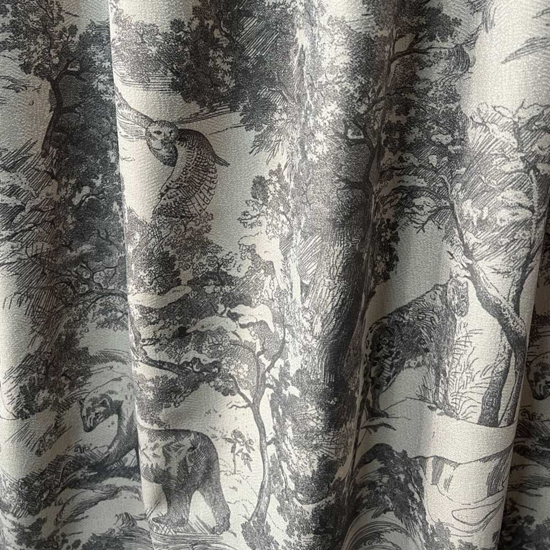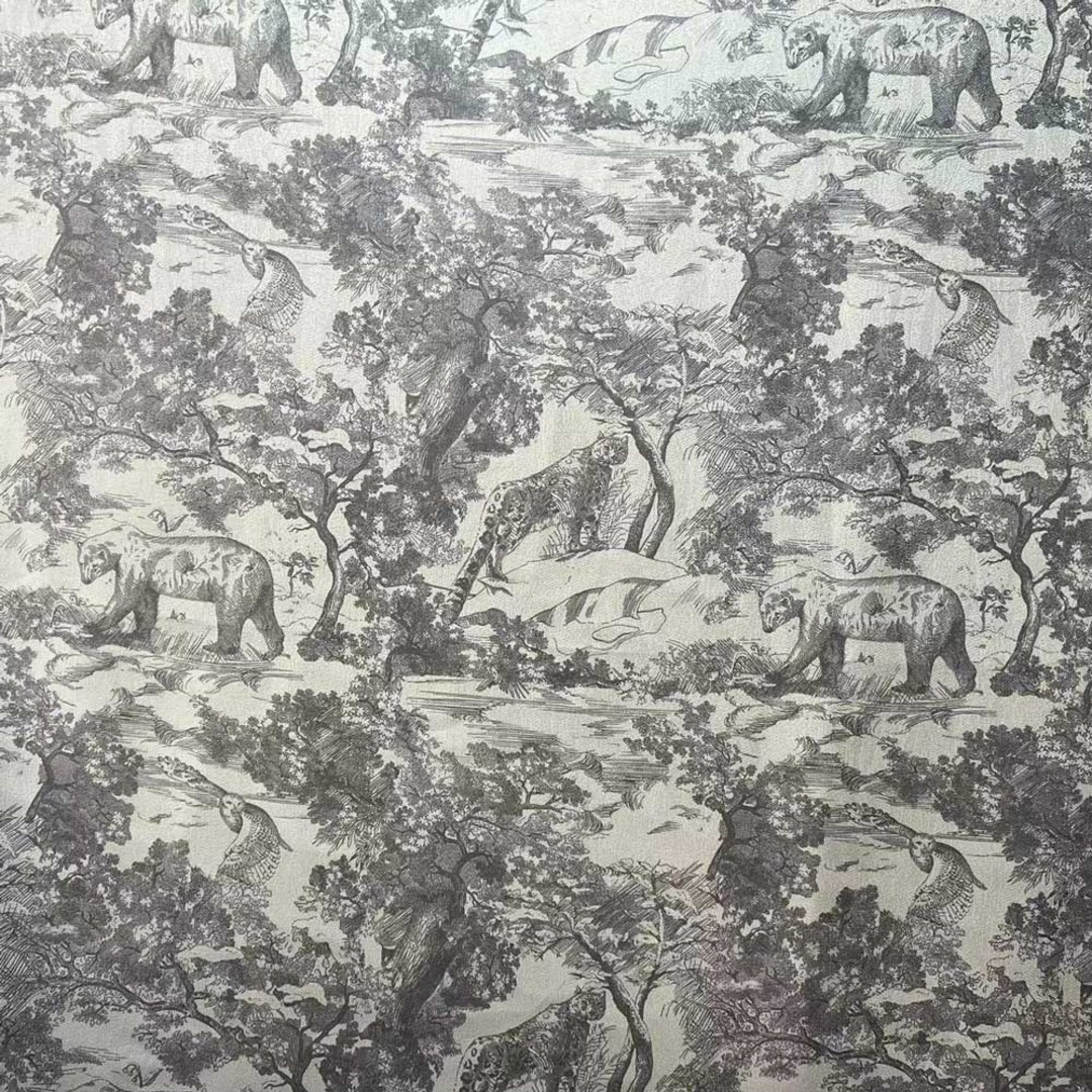 Erleben Sie die bezaubernde Atmosphäre von französischem Toile de Jouy, während dieser anthrazitgraue Verdunklungsvorhang anmutig Ihre Fenster umhüllt und Ihrem Zuhause einen faszinierenden und beruhigenden Touch verleiht. Sein opulenter Hintergrund zeigt eine akribisch gewebte Waldszene mit zarten Bär-, Eulen- und Leopardenmotiven, die eine ungezähmte Schönheit verleihen. Unsere maßgefertigten Vorhänge werden nach Ihren genauen Anforderungen gefertigt und sind in verschiedenen Aufhängungsarten erhältlich – Ösen, Schlaufen, Falten, Doppelstich, Pinch Pleat Vorhänge, Wellenvorhänge. Bestellen Sie passende Gardinenbänder, Kissen, Tischläufer und Platzsets, um das gesamte Raumambiente zu verbessern. Entdecken Sie, wie ein Toile de Jouy Vorhang jeden Raum aufwerten kann.