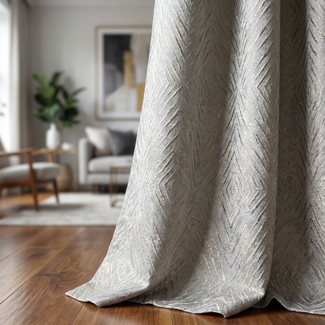 Diese luxuriösen 3D-Jacquard-Rautenmuster-silbergrauen Vorhänge sind modern und stilvoll. Die filigrane Textur, der exquisite Goldglitzer und die anspruchsvolle Farbe ergänzen jeden Raum Ihrer Wahl. Unsere maßgefertigten Vorhänge werden sorgfältig nach Ihren spezifischen Wünschen gefertigt. Sie sind in einer Vielzahl von Kopfformen erhältlich, die Ihrem Geschmack entsprechen, darunter Schlingen, Ösen, Stillfalten, Maßfalten, umgekehrte Kastenfalten, Schlaufen, Rückenschlaufen, Stangentasche und Wellenvorhänge.Chevron/Wellen-Vorhang-Ideen – der einfache Weg, um Ihr Zuhause zu verwandeln.HINWEIS: Nicht-Railroaded-Muster läuft die Rolle hoch, parallel zum Kettelrand. Die Ausrichtung des Musters ermöglicht es Ihnen, einen Vorhang in beliebiger Länge herzustellen, ohne horizontale Nähte hinzufügen zu müssen.