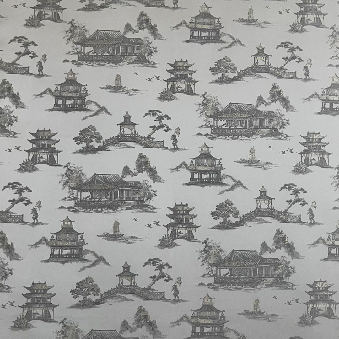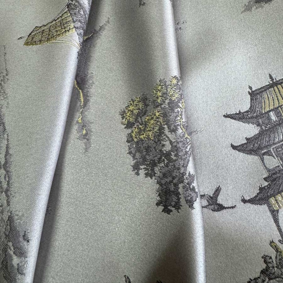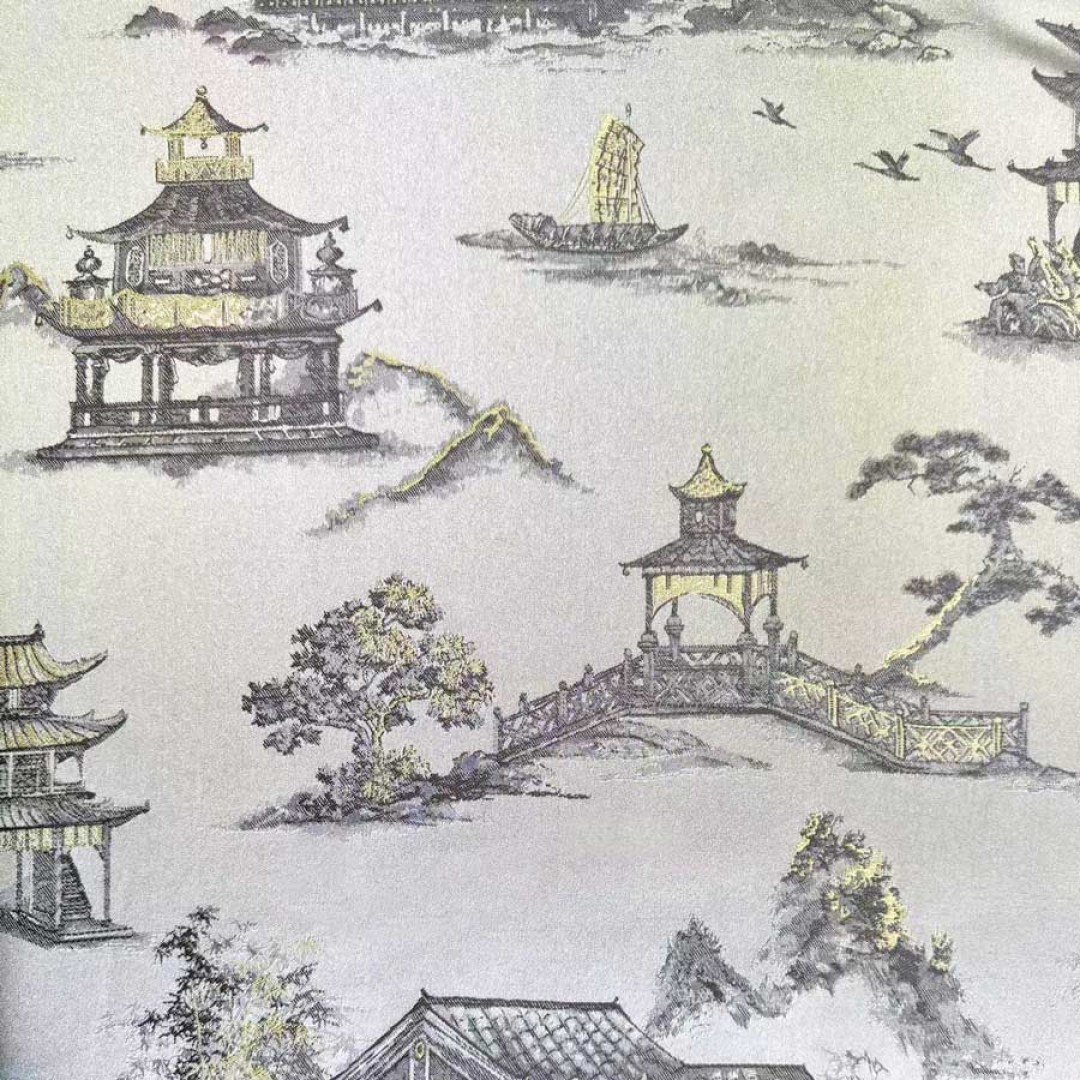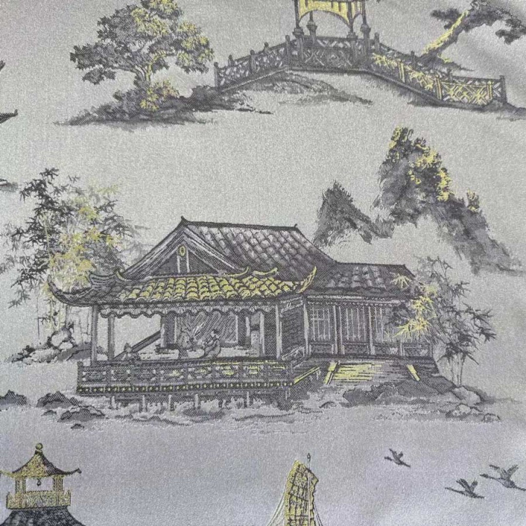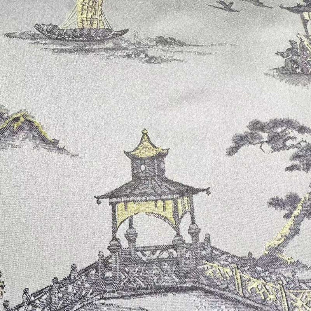 Seidiger, ästhetischer Luxus-Jacquardstoff mit Darstellung einer orientalischen Wasserstadt mit Pagoden, Brücken, Dschunken, Gärten und Menschen bei Unterhaltungen in Pavillons. Die Motive sind reich an Details und leuchtenden Farben und zeigen Szenen, die von klassischer chinesischer Kunst und Kultur inspiriert sind.