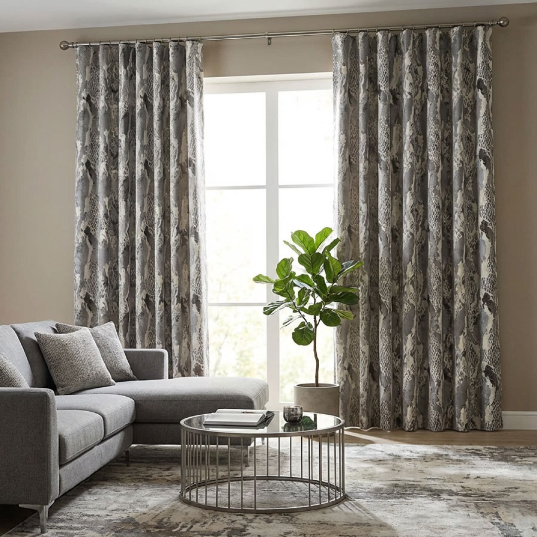 Dieser luxuriöse Jacquardstoff mit einer Mischung aus metallischen Tönen und Reptilienmustern bietet ein mutiges und anspruchsvolles Design für zeitgenössische Einrichtungen. Unsere maßgefertigten Vorhänge werden sorgfältig nach Ihren individuellen Wünschen gefertigt. Sie sind in einer Vielzahl von Aufhängungsarten erhältlich, die Ihrem Geschmack entsprechen, darunter Schlingen, Ösen, Plissees, Wellenschlagfalten, umgekehrte Kastenfalten, Schlaufen, Rückenschlaufen, Stangentaschen, Flächenvorhänge und Türvorhänge. Entdecken Sie weitere exquisite Tierdruckvorhänge.