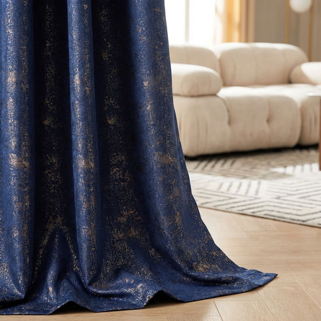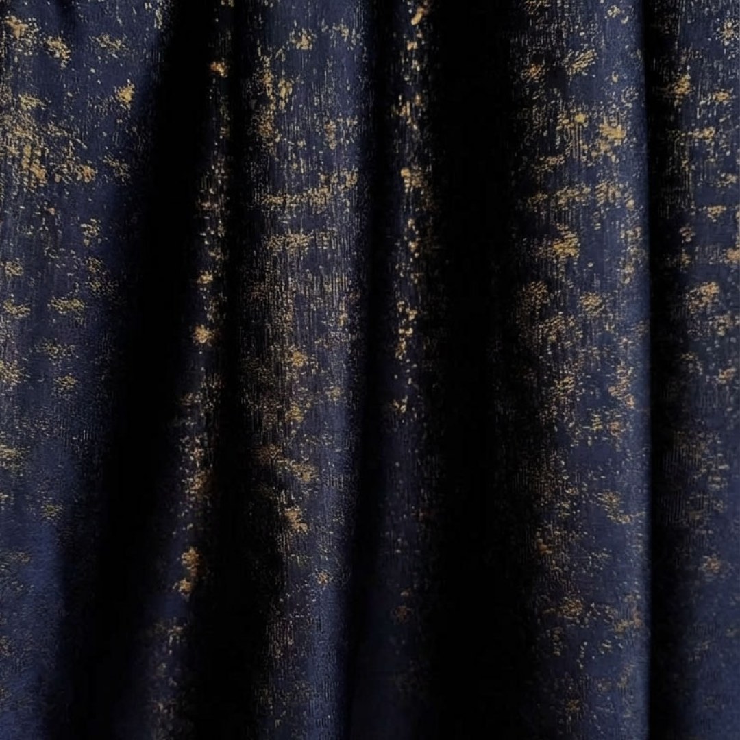 Ein luxuriöser Textil, der mit seinen verstreuten goldenen Akzenten auf einem dunklen, geheimnisvollen Grund die Schönheit interstellarer Wolken hervorruft. Unsere maßgefertigten Vorhänge werden sorgfältig nach Ihren spezifischen Wünschen gefertigt. Sie sind in einer Vielzahl von Kopfformen erhältlich, die Ihrem Geschmack entsprechen, darunter Schlingen, Ösen, Zwickfalten, Maßfalten, umgekehrte Kastenfalten, Schlaufen, Rückenschlaufen, Stangentasche und Wellenvorhänge. Entdecken Sie, wie Glitzer-Vorhänge jeden Raum aufwerten können.