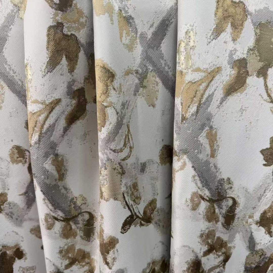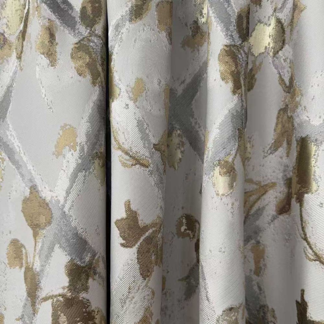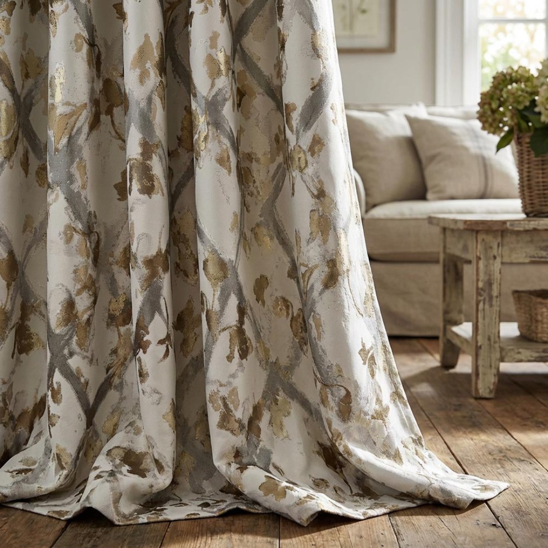Mit einem zarten Gittermuster, das mit weichen floralen Akzenten in gedämpftem Gold und Elfenbein verwoben ist, verleiht dieser luxuriöse Stoff jedem Raum einen Hauch zeitloser Eleganz. Perfekt, um eine warme und einladende Atmosphäre zu schaffen, ist er ideal für sowohl moderne als auch klassische Innenräume.