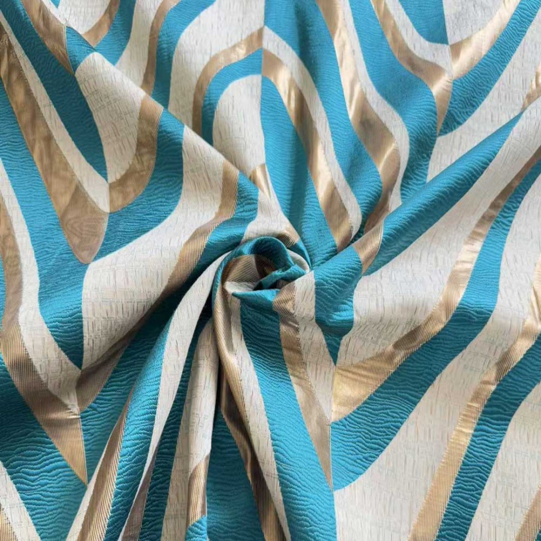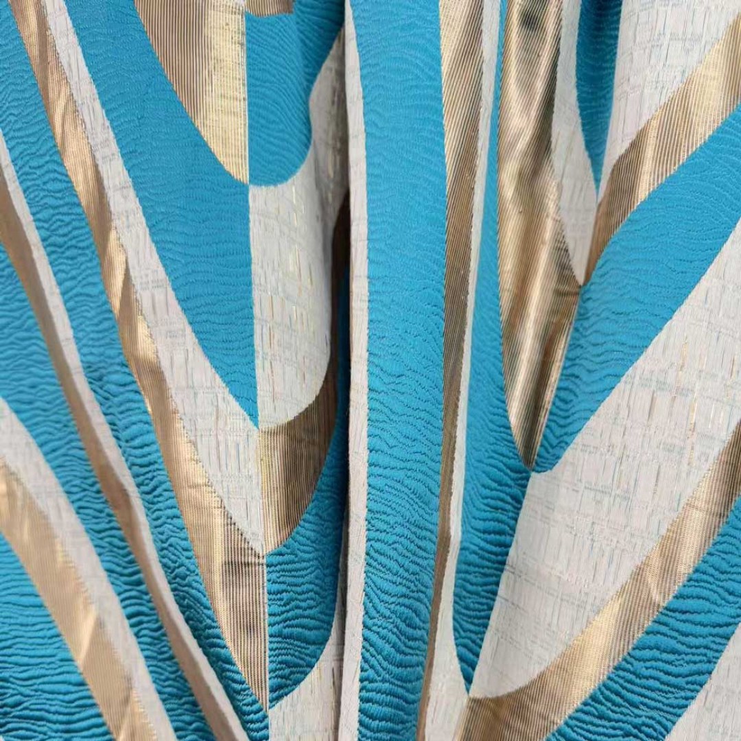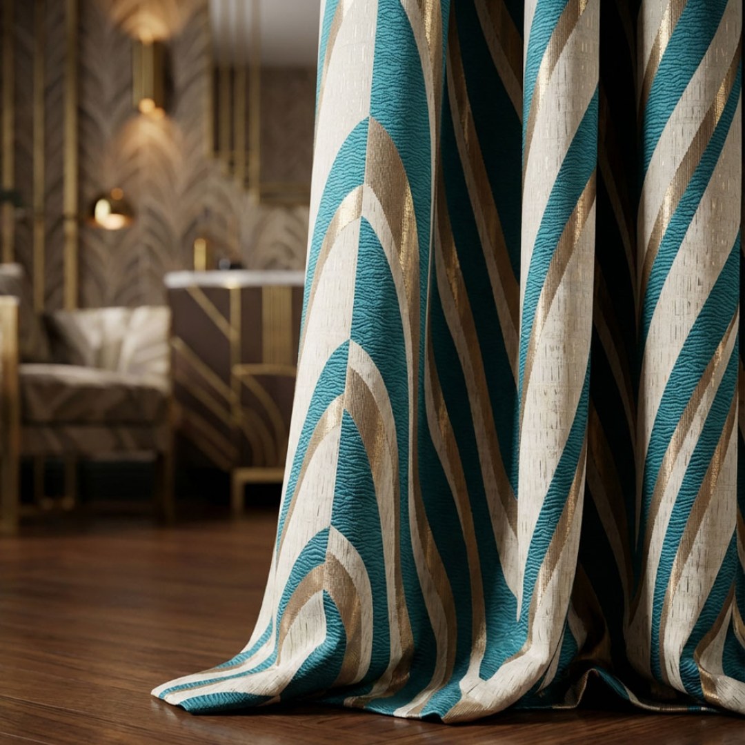 Erweitern Sie Ihren Raum mit dem zeitlosen Ocean Wave Elegance Vorhangstoff, der den ikonischen Art-Deco-Stil mit seinen kräftigen, geometrischen Wellenmustern und dem luxuriösen Design verkörpert. Perfekt, um Wohnzimmern, Schlafzimmern oder Büros einen Hauch von Vintage-Glamour zu verleihen, vereint dieses hochwertige Material Strapazierfähigkeit mit einer eleganten Ästhetik. Unsere maßgefertigten Vorhänge werden sorgfältig nach Ihren spezifischen Wünschen gefertigt. Sie sind in einer Vielzahl von Kopfformen erhältlich, die Ihrem Geschmack entsprechen, darunter Schlitze, Ösen, Zwickfalten, Maßfalten, umgekehrte Kastenfalten, Schlaufen, Rückenschlaufen, Stangentasche und Wellenvorhänge. Entdecken Sie, wie Art-Deco-Vorhänge jeden Raum aufwerten können.