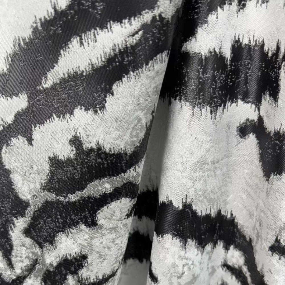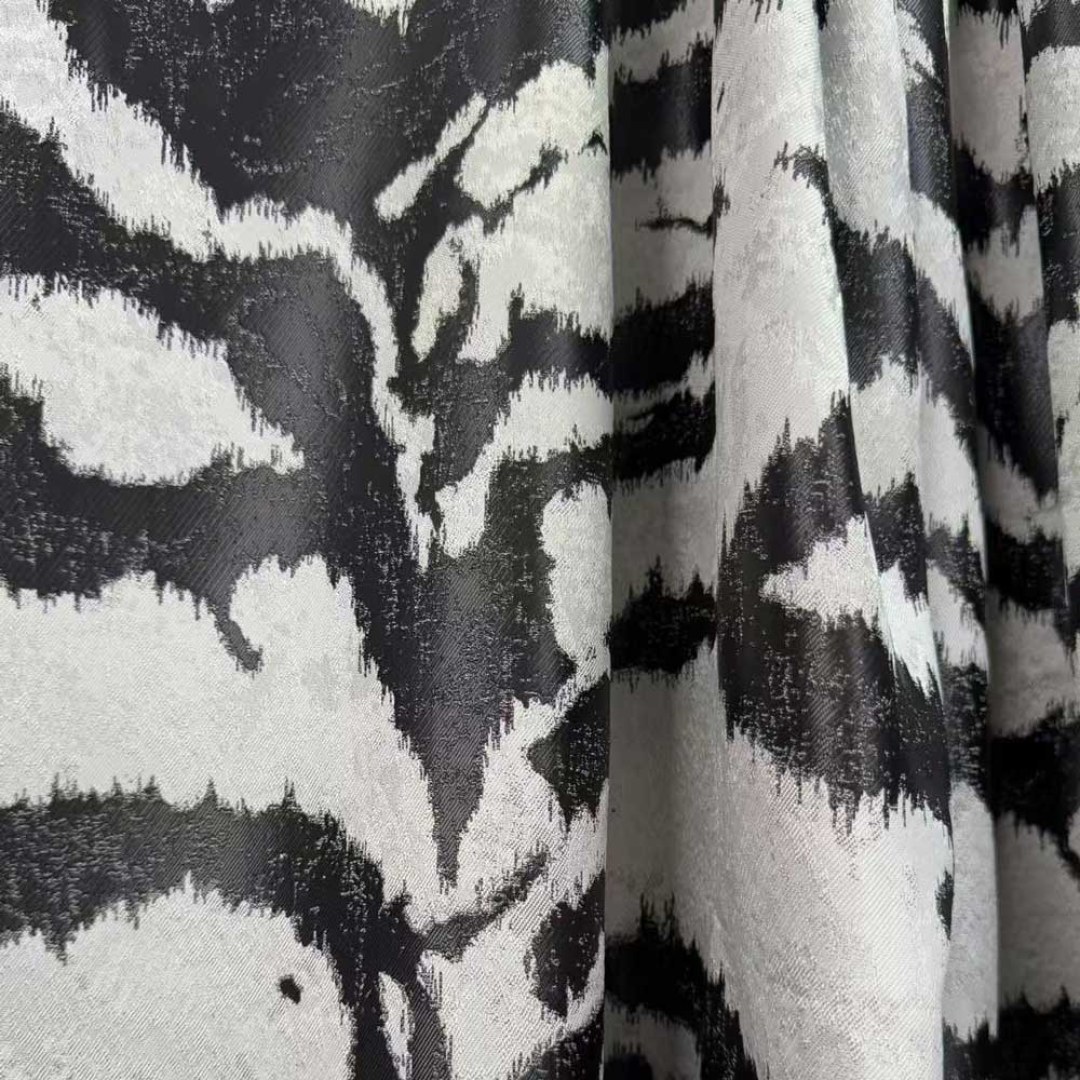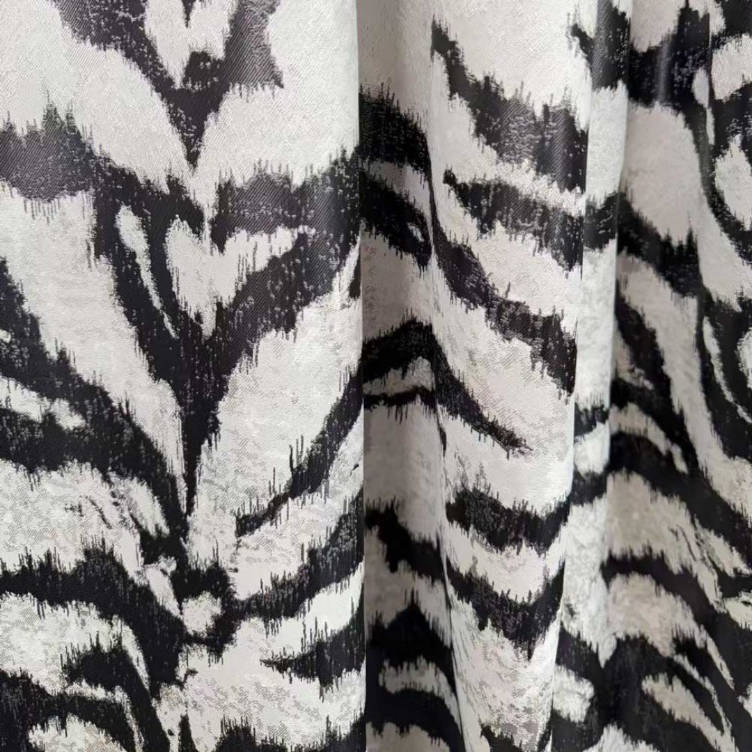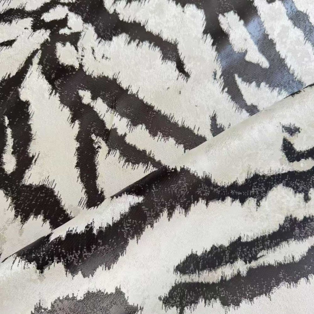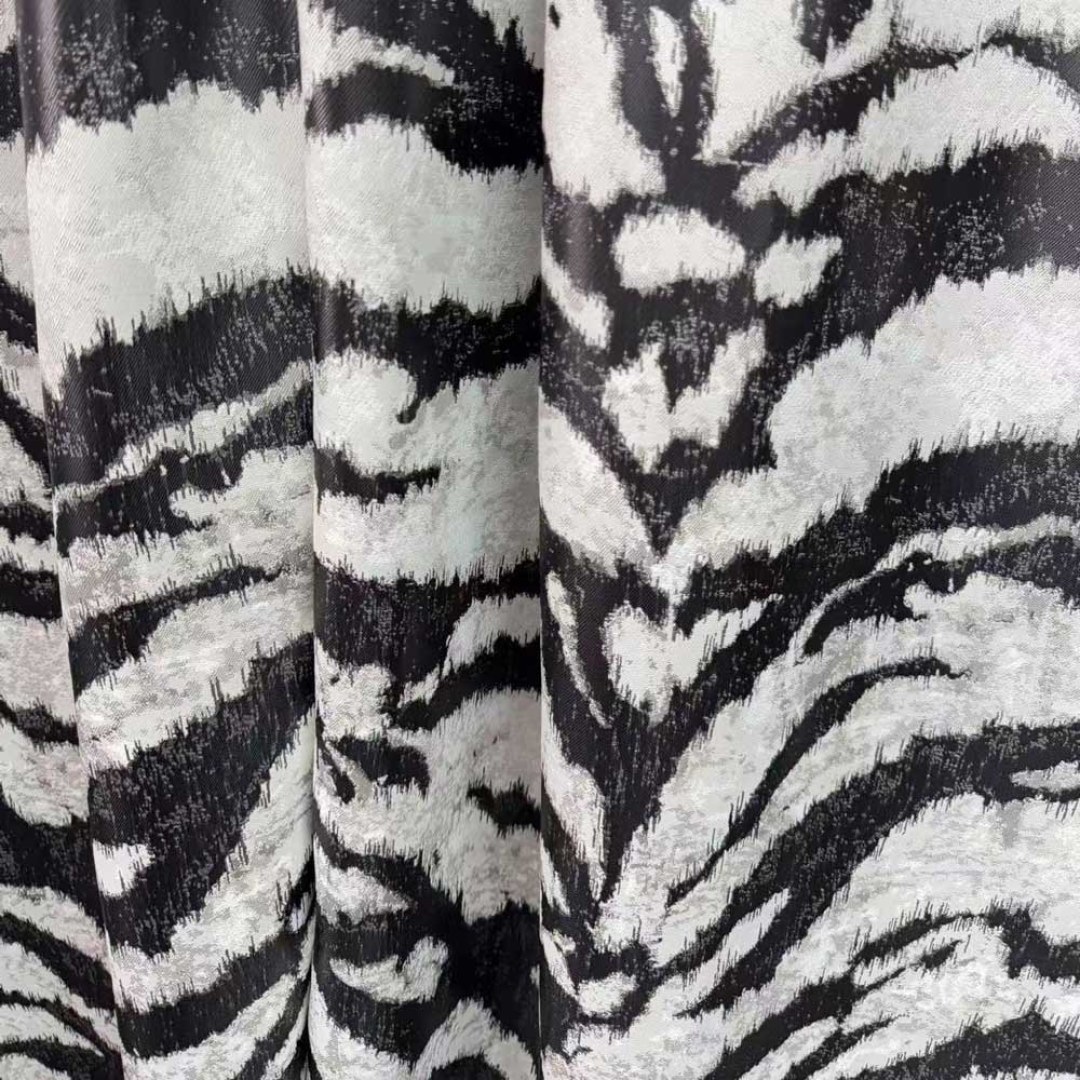 Entfesseln Sie ein Gefühl von kühner Raffinesse mit diesem luxuriösen Jacquard-Vorhangstoff, der ein kunstvoll abstraktiertes Tigerstreifenmuster aufweist. Die reich strukturierte Webart verleiht jedem Raum Tiefe und Dramatik und verbindet wilde Eleganz mit modernem Design.
