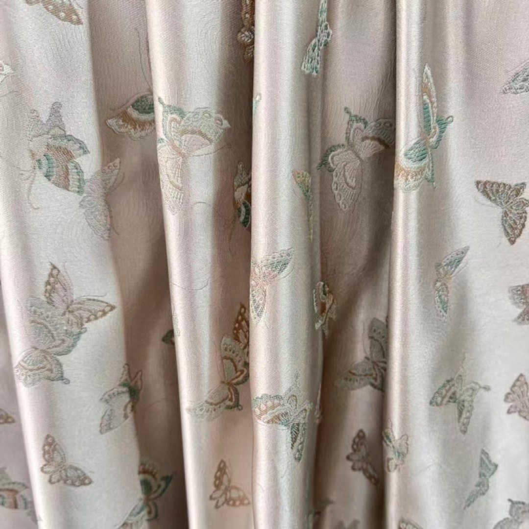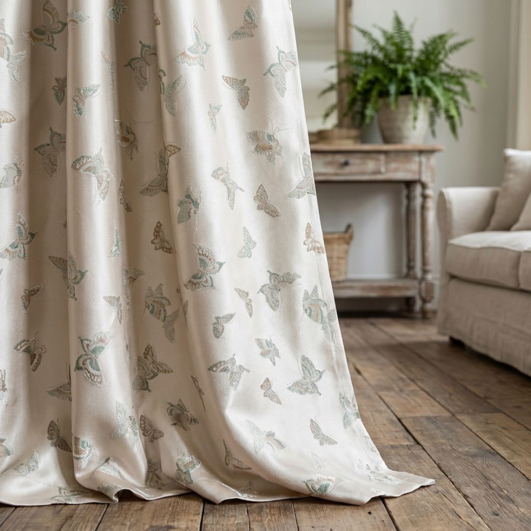 Mit einem zarten Muster aus kunstvoll bestickten Schmetterlingen, die vor einem weichen Cremeton schweben, verleiht dieser luxuriöse Stoff einen verspielten und doch anspruchsvollen Charme. Ideal zur Schaffung einer ruhigen und luftigen Atmosphäre, ist er perfekt für Wohnzimmer, Schlafzimmer oder jeden Raum, der einen sanften, von der Natur inspirierten Akzent benötigt.