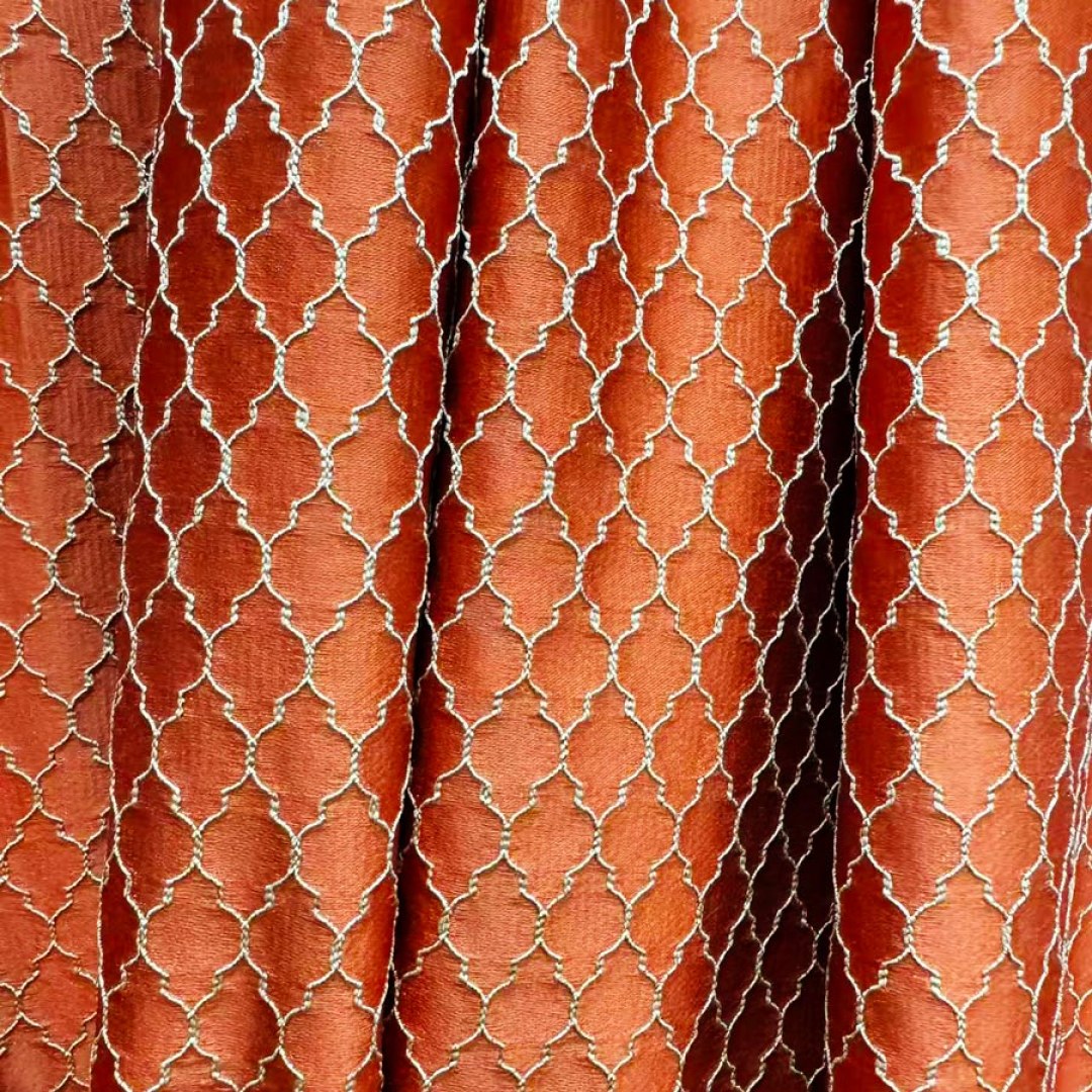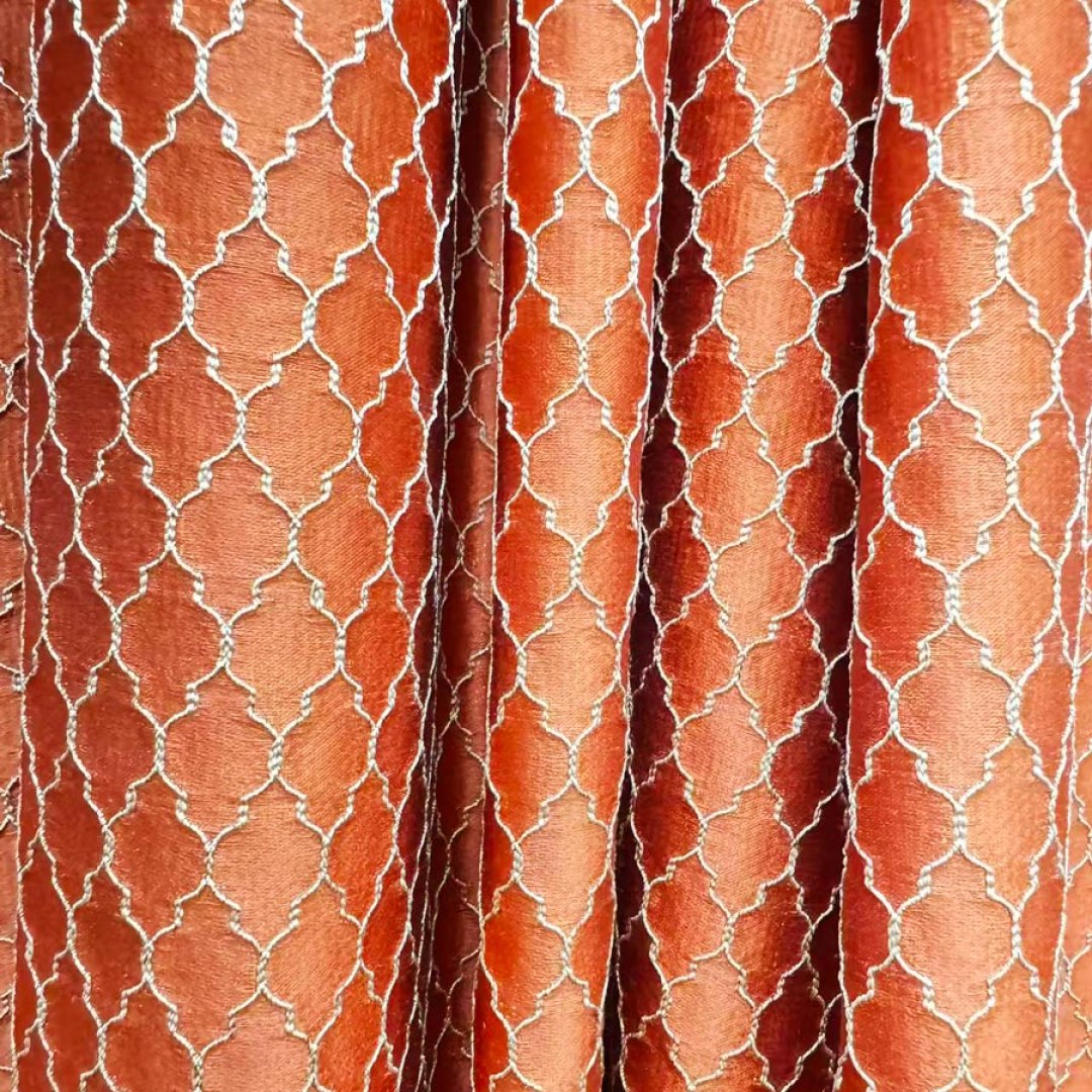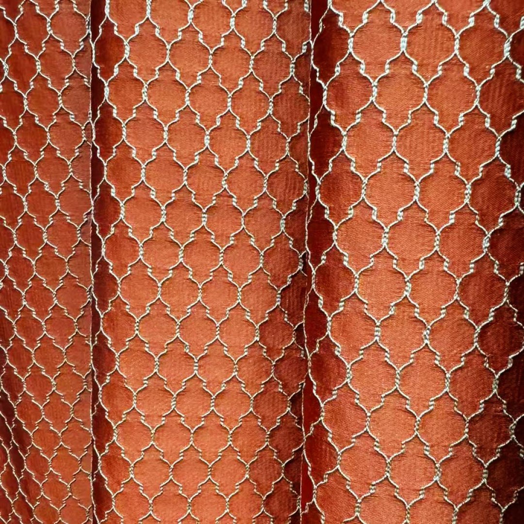 Dieser luxuriöse Stoff für Vorhänge präsentiert ein filigranes Arabeskenmuster, durchzogen von eleganten goldenen Akzenten in einem strukturierten Design.