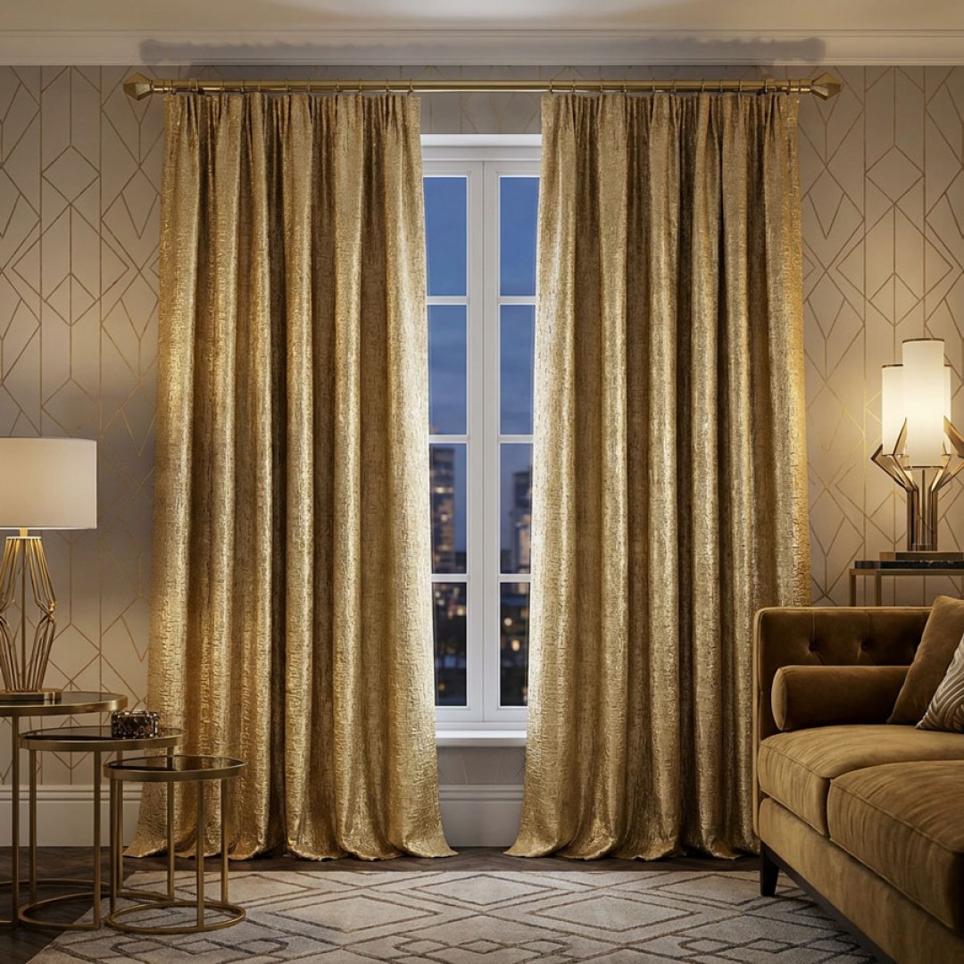 Kühn und fesselnd, kombiniert dieser Jacquard-Vorhang ein reichhaltiges, leuchtendes Finish mit schimmernden metallischen Akzenten, um einen Look zeitgenössischer Glamour zu schaffen.