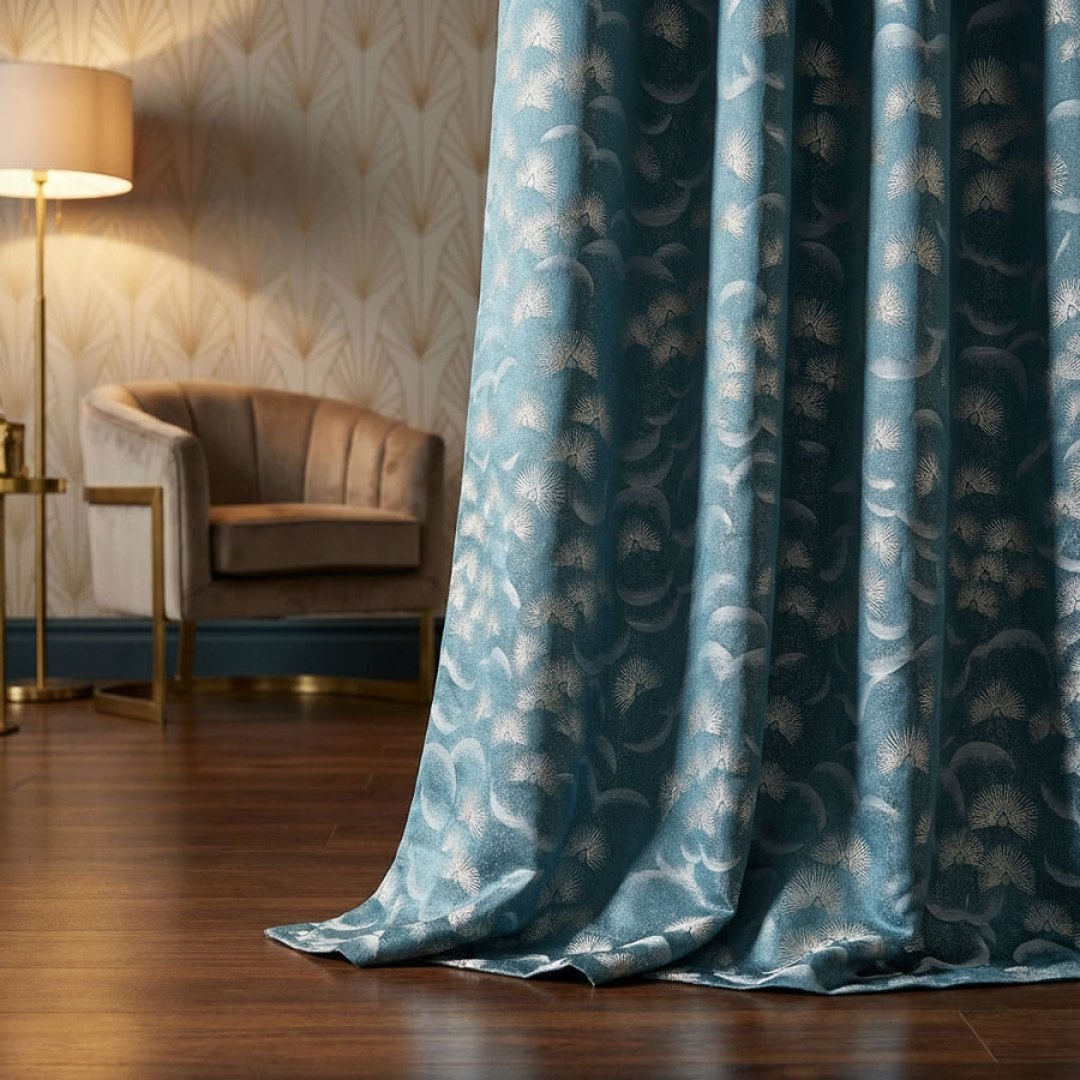 Dieser Vorhang zeichnet sich durch ein Art-Déco-inspiriertes Fächermotiv aus, das mit asiatischer Anmut verschmilzt und eine raffinierte Balance zwischen Geometrie und sanfter Bewegung schafft. Das strukturierte Jacquard-Muster verleiht Tiefe und Raffinesse, ideal für kuratierte Innenräume, die nach ruhiger Eleganz mit einem Hauch von globalem Designgeist suchen.