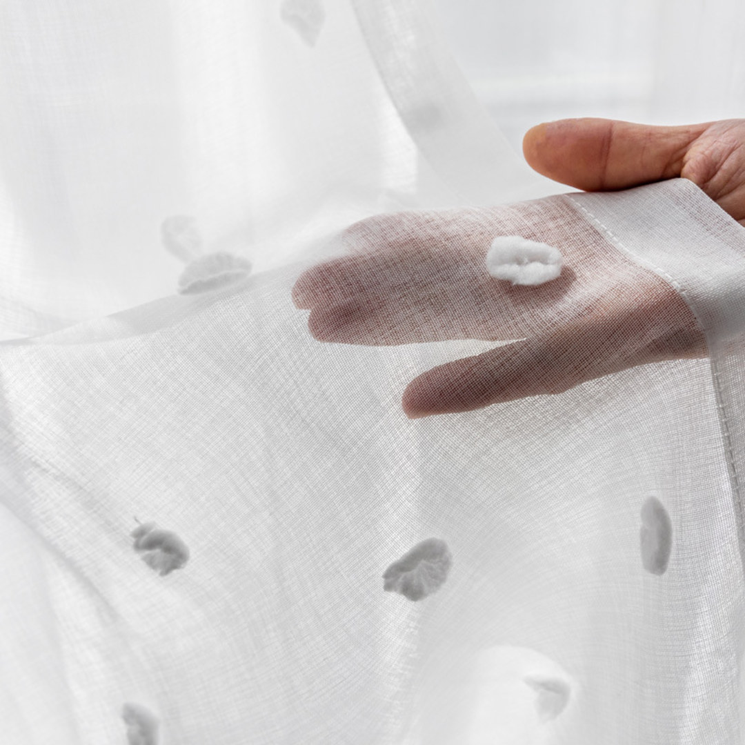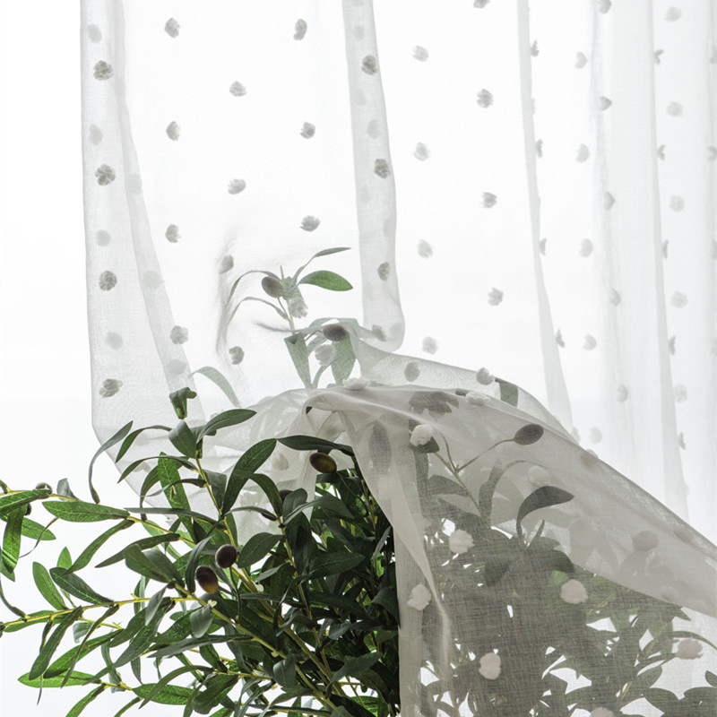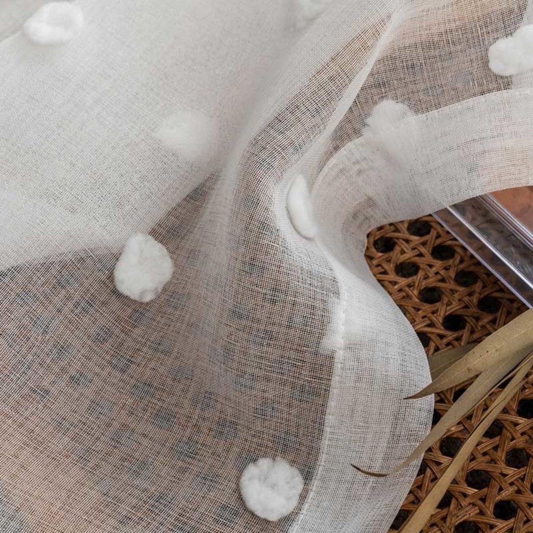Dieser wunderschöne, flauschige Pompon-Voilevorhang mit weißen Punkten lässt Tageslicht durch, während er die Privatsphäre in Ihrem Zuhause wahrt und ist somit perfekt für Wohnzimmer-French-Door-Vorhänge und Schiebetürvorhänge. Die filigranen Muster und die 3D-Texturen schaffen einen eleganten und klassischen Raum, ohne die minimalistische Ästhetik zu verlieren. Unsere maßgefertigten Vorhänge werden sorgfältig nach Ihren spezifischen Wünschen gefertigt. Sie sind in verschiedenen Falten erhältlich, um Ihrem Geschmack gerecht zu werden, darunter Schlingen, Ösen, Zwickfalten, Maßfalten, umgekehrte Kastenfalten, Schlaufen, Rückenschlaufen, Schlauchtasche und Wellenvorhänge. Entdecken Sie, wie gepunktete Voilevorhänge jeden Raum aufwerten können.