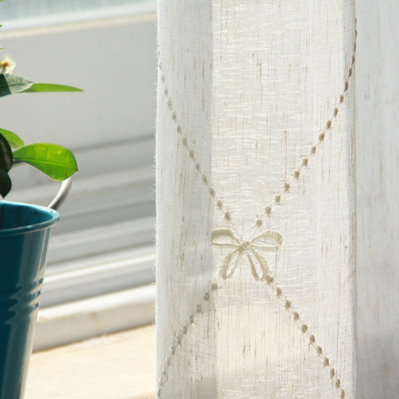 Die atemberaubenden Anastasia Vorhänge lassen viel Licht in den Raum und verleihen einen Hauch von Eleganz. Das wunderschöne bestickte Schleifendetail rundet diese luxuriösen Vorhänge perfekt ab. Erhältlich in Haferfarben. Unsere maßgefertigten Vorhänge werden genau nach Ihren Fensteranforderungen erstellt und sind in verschiedenen Aufhängungsarten erhältlich – Ösen, Schlaufen, Plisseekraftband, doppelter Plisseekraftband, Bogenfalten oder Stangentasche. Entdecken Sie, wie die bestickten Voile-Vorhänge jeden Raum aufwerten können.