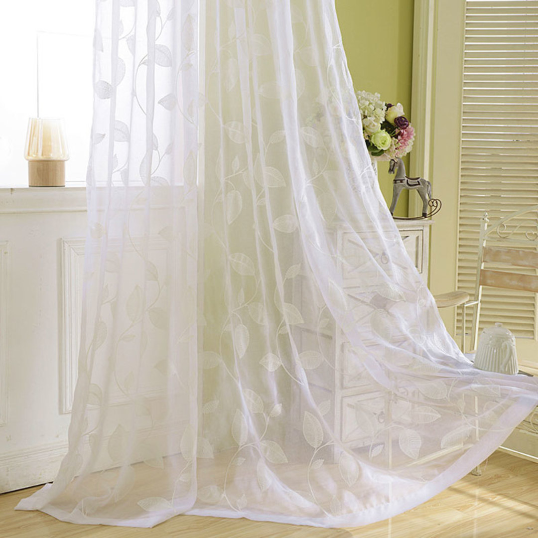 Füllen Sie Ihr Zuhause mit frischer Luft und natürlichem Sonnenschein, als wären Sie in einem luftigen Wald. Die zarte Blattstickerei schafft einen eleganten und raffinierten Look, der den Raum aufhellt und gleichzeitig Ihre Privatsphäre schützt. Unsere maßgefertigten Voile-Vorhänge werden sorgfältig nach Ihren spezifischen Wünschen gefertigt. Sie sind in einer Vielzahl von Kopfformen erhältlich, die Ihrem Geschmack entsprechen, darunter Wellenschlagfalte, Ösen, Zwickfalte, Maßfalte, umgekehrte Kastenfalte, Schlaufen, Rückenschlaufen, Schlauchtasche und Wave-Vorhang.Entdecken Sie, wie gestickte Voile-Vorhänge jeden Raum verschönern können.HINWEIS: Der bestickte Teil des Stoffes beträgt etwa 204 cm; es gibt 59 cm blankes weißes Transparent bis zum unteren Rand und etwa 17 cm blankes weißes Transparent bis zum oberen Rand.