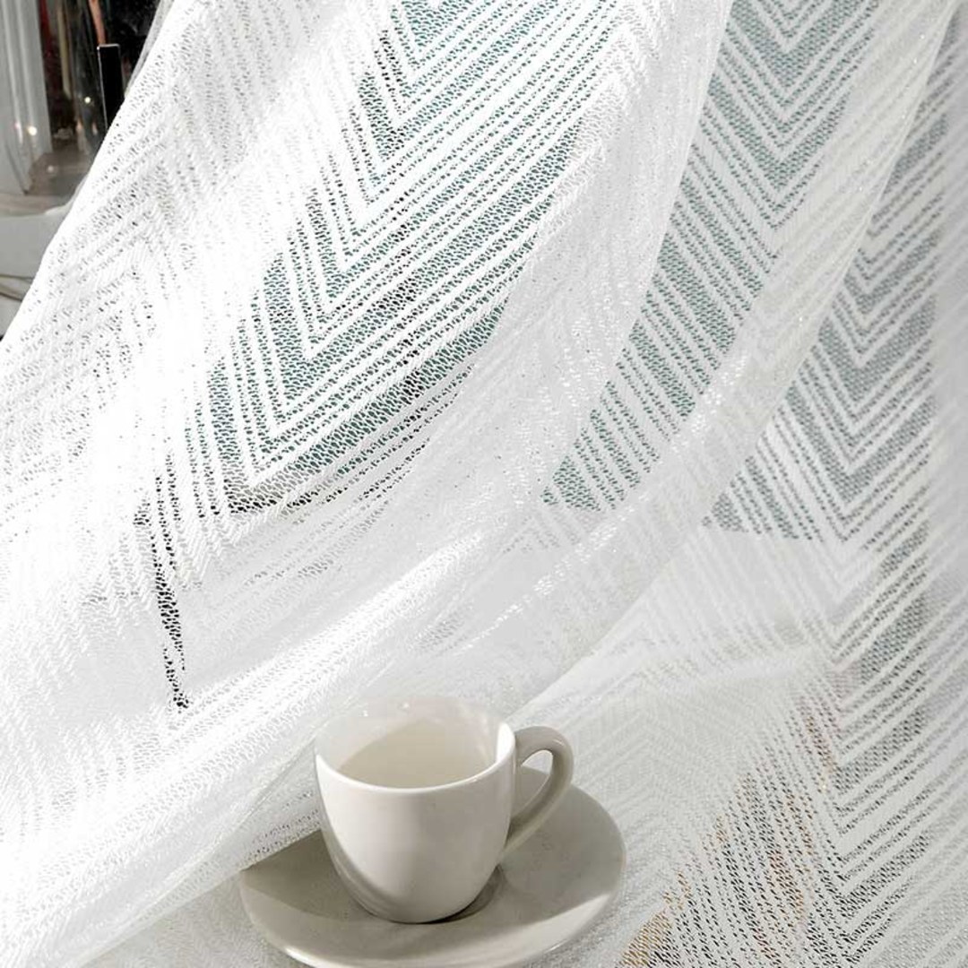 Diese schimmernden, modernen, geometrischen Spitzennetzvorhänge haben komplizierte Muster und Texturen. Sie schaffen einen eleganten und klassischen Raum, ohne die minimalistische Ästhetik zu verlieren. Der geschwungene Saum verleiht diesen exquisiten Vorhängen ein elegantes Finish. Unsere maßgefertigten Vorhänge werden sorgfältig gefertigt, um Ihren spezifischen Vorlieben gerecht zu werden. Sie sind in einer Vielzahl von Kopfformen erhältlich, die Ihrem Geschmack entsprechen, darunter Wellenschlagfalte, Ösen, Zwickfalte, Maßfalte, umgekehrte Kastenfalte, Schlaufen, Rückenschlaufen, Stangentasche, Wellenoptik und Türnetzvorhänge.Entdecken Sie, wie Chevron-Voilevorhänge jeden Raum aufwerten können. *HINWEIS: Aufgrund des geschwungenen Saums dieser Vorhänge teilen Sie uns bitte mit, wenn Sie Gewichte hinzufügen möchten, ob Sie den geschwungenen Saum beibehalten oder gerade schneiden möchten.