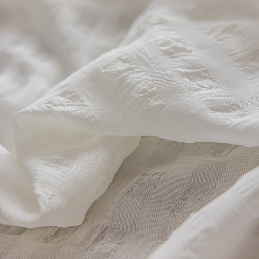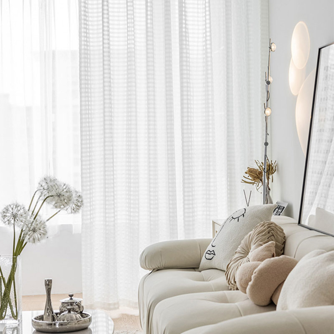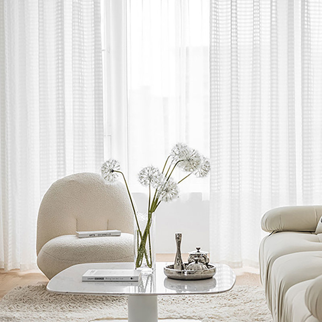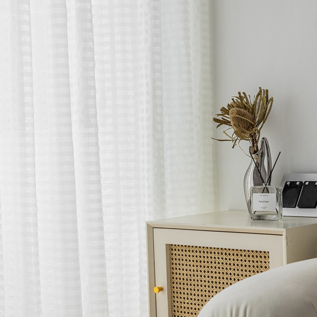 Knitter- oder zerknitterter Voilevorhang hat in den letzten Jahren zunehmend an Beliebtheit gewonnen. Der Bubble Up elfenbeinfarbene zerknitterte Voilevorhang weist ein einzigartiges Karomuster auf. Die reichen Texturen und die schöne Verarbeitung verleihen einen raffinierten und luxuriösen Look.