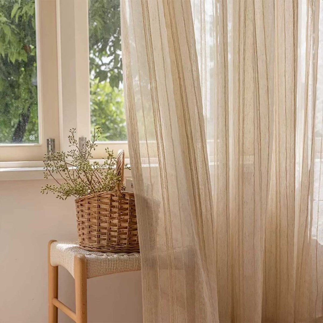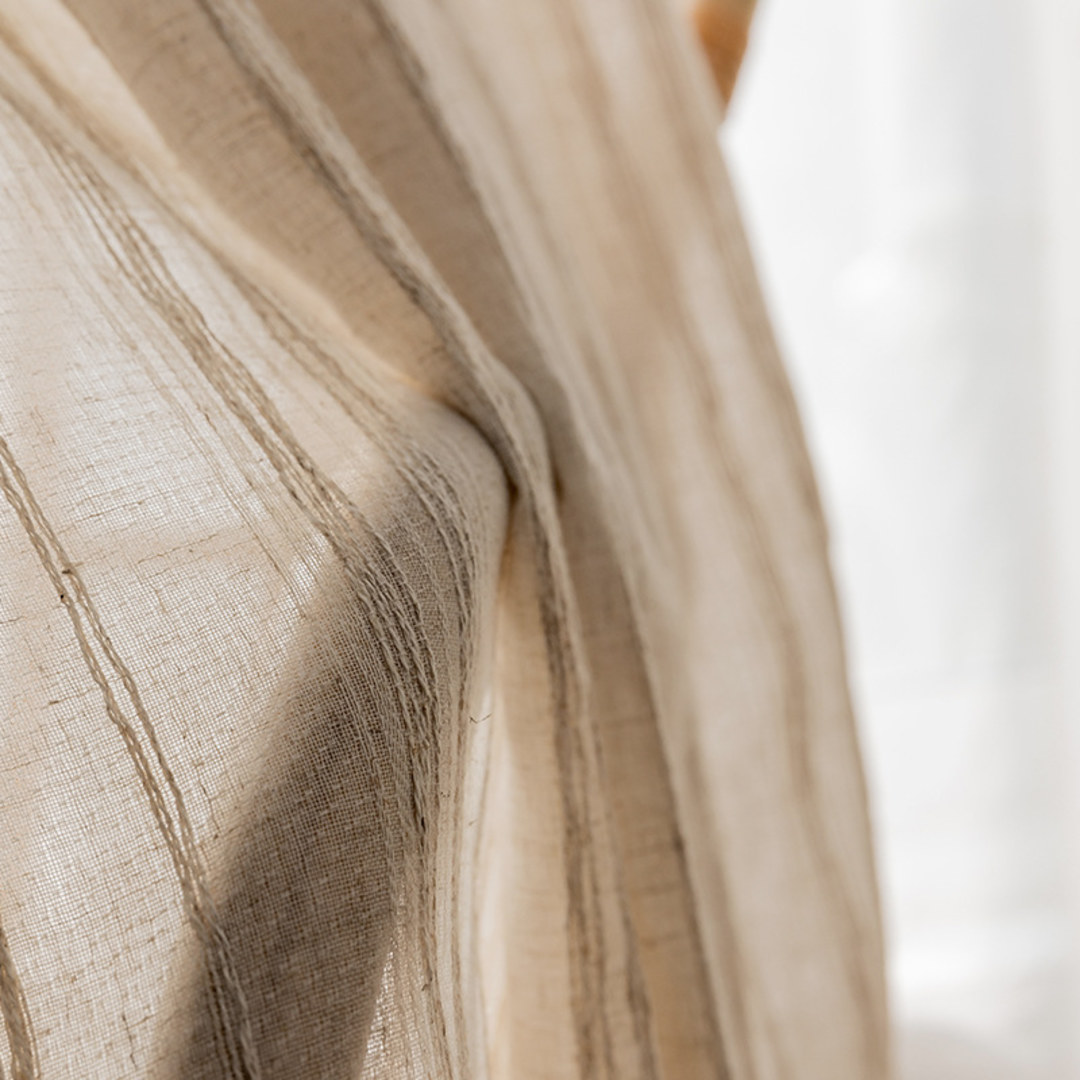 Fügen Sie Ihrem Raum weiches Licht hinzu und schaffen Sie gleichzeitig Privatsphäre mit diesen stilvollen gestreiften Leinen-Voile-Vorhängen. Der Raum nimmt eine schlichte und dezente Farbpalette an, wobei die Voiles durch klare Linien subtil modernisiert werden und einen Hauch von zeitloser Eleganz verleihen. Unsere maßgefertigten Voile-Vorhänge werden sorgfältig nach Ihren spezifischen Wünschen gefertigt. Sie sind in einer Vielzahl von Kopfformen erhältlich, die Ihrem Geschmack entsprechen, darunter Schlingen, Ösen, Stillfalten, Maßfalten, umgekehrte Kastenfalten, Schlaufen, Rückenschlaufen, Tunnelzug und Wellenvorhänge. Entdecken Sie, wie gestreifte Voile-Vorhänge jeden Raum aufwerten können.