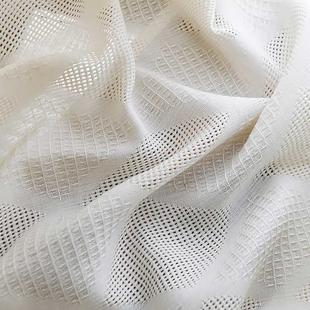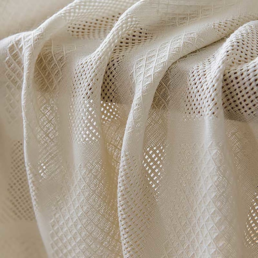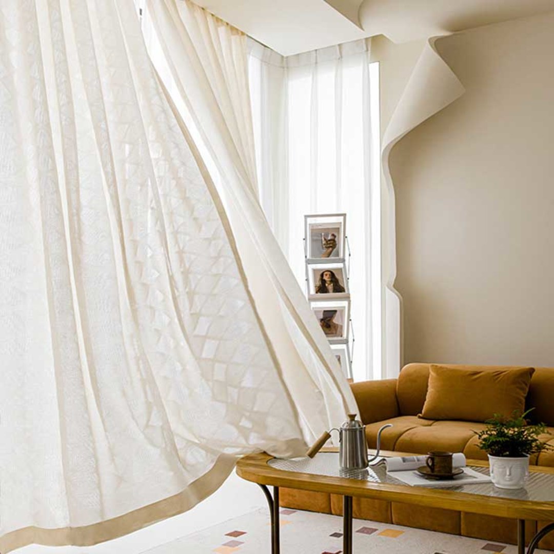 Fügen Sie Ihrem Raum weiches Licht hinzu und schaffen Sie gleichzeitig Privatsphäre mit diesen stilvollen, rautenförmigen, elfenbeinfarbenen, schweren Voile-Vorhängen. Der Raum genießt eine schlichte und dezente Farbpalette. Die Voiles werden durch geometrische Muster sanft modernisiert. Unsere maßgefertigten Voile-Vorhänge werden sorgfältig nach Ihren spezifischen Wünschen gefertigt. Sie sind in einer Vielzahl von Kopfformen erhältlich, die Ihrem Geschmack entsprechen, darunter Schlitze, Ösen, Zwickfalten, maßgeschneiderte Falten, umgekehrte Kastenfalten, Schlaufen, Rückenschlaufen, Stangentasche, Wellen und Türfenstervorhänge. Entdecken Sie, wie geometrische Voile-Vorhänge jeden Raum aufwerten können.