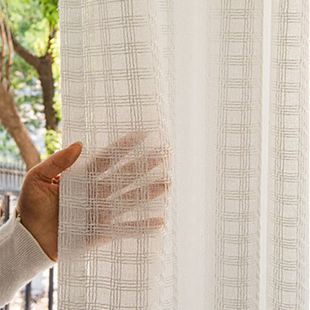 Elfenbeinfarbenes kariertes Leinenoptik-Voile-Vorhang verbindet moderne Raffinesse und dezente Eleganz. Die fein gearbeiteten Karomuster erzeugen ein Gefühl dynamischer Bewegung. Unsere maßgefertigten Voile-Vorhänge werden genau nach Ihren Fensteranforderungen gefertigt und sind in verschiedenen Aufhängungsarten erhältlich, darunter Ösen, Schlingen, Wellenschlag, Flächenvorhang, Kastenplisse, Schlaufen oder Gardinen mit Tunnelzug. Entdecken Sie, wie karierte Voile-Vorhänge jeden Raum aufwerten können.