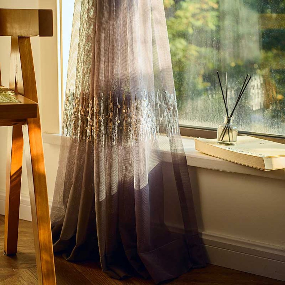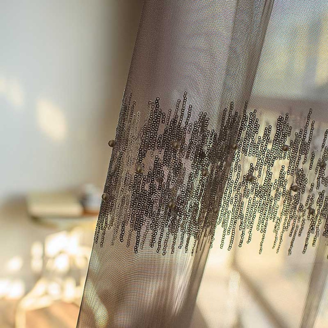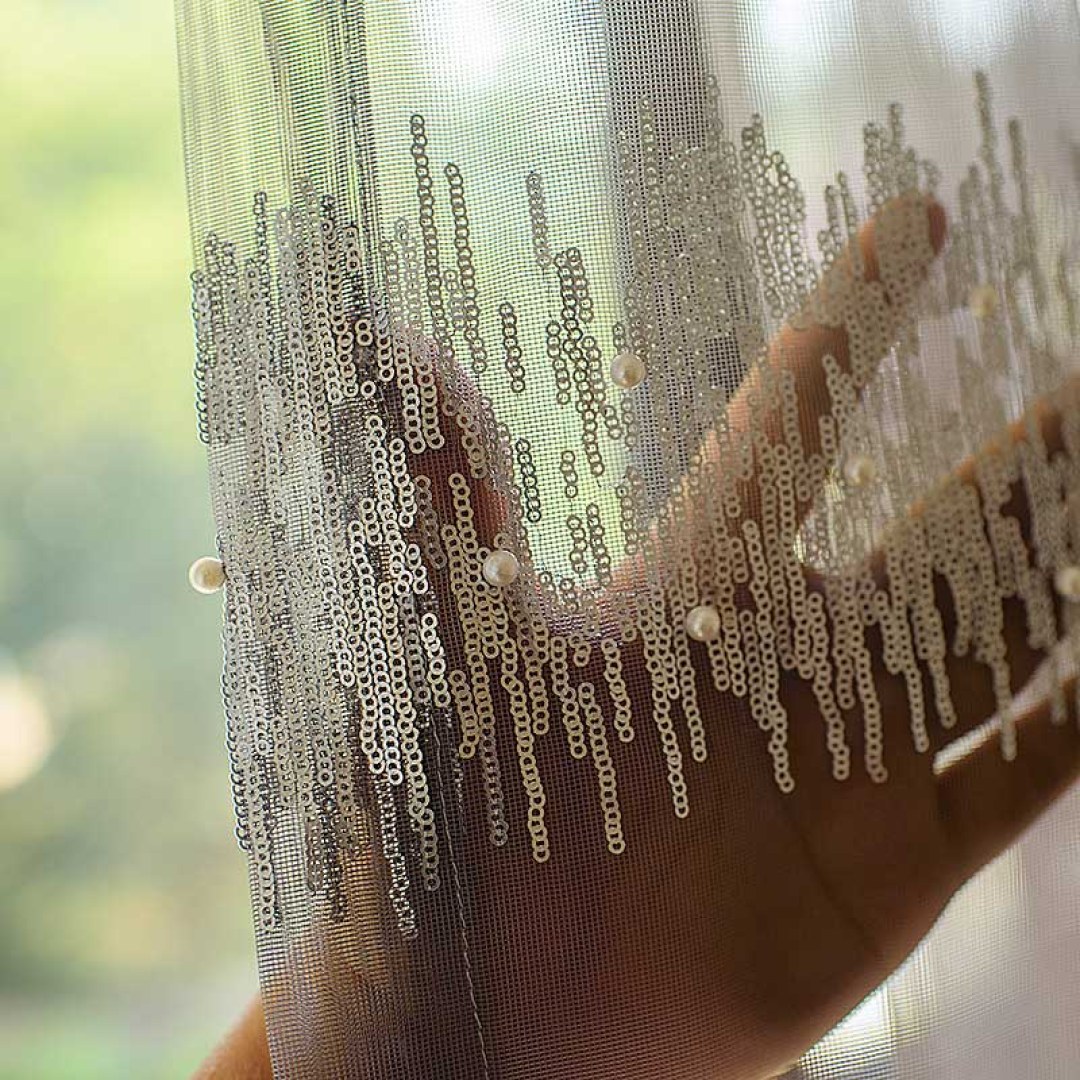 Dieser zarte, graue Voile-Vorhang ist exquisit mit schimmernden Pailletten und Perlen verziert und bietet die perfekte Balance zwischen Eleganz und Subtilität. Die aufwendige Stickerei bildet ein atemberaubendes Design, das moderne oder klassische Innenräume anmutig ergänzt, das Licht wunderschön filtert und jedem Raum einen Hauch von Luxus verleiht. Unsere maßgefertigten Vorhänge werden sorgfältig nach Ihren individuellen Vorlieben gefertigt. Sie sind in einer Vielzahl von Falten erhältlich, um Ihrem Geschmack gerecht zu werden, darunter Schlingen, Ösen, Zwickfalten, Maßfalten, umgekehrte Kastenfalten, Schlaufen, Rückenschlaufen, Schlauchtasche und Wellenvorhänge. Entdecken Sie, wie Paillettenvorhänge und Perlenvorhänge jeden Raum aufwerten können.