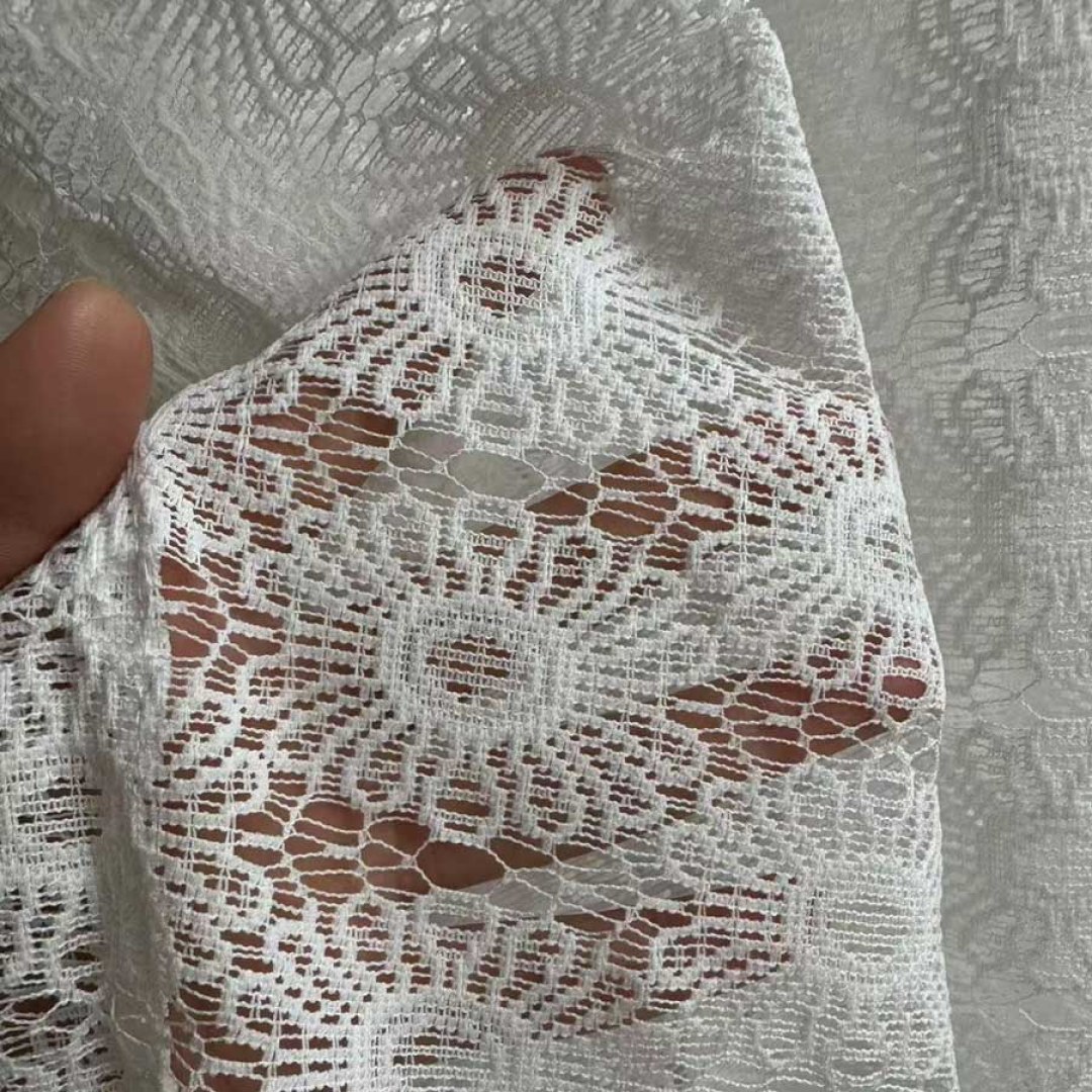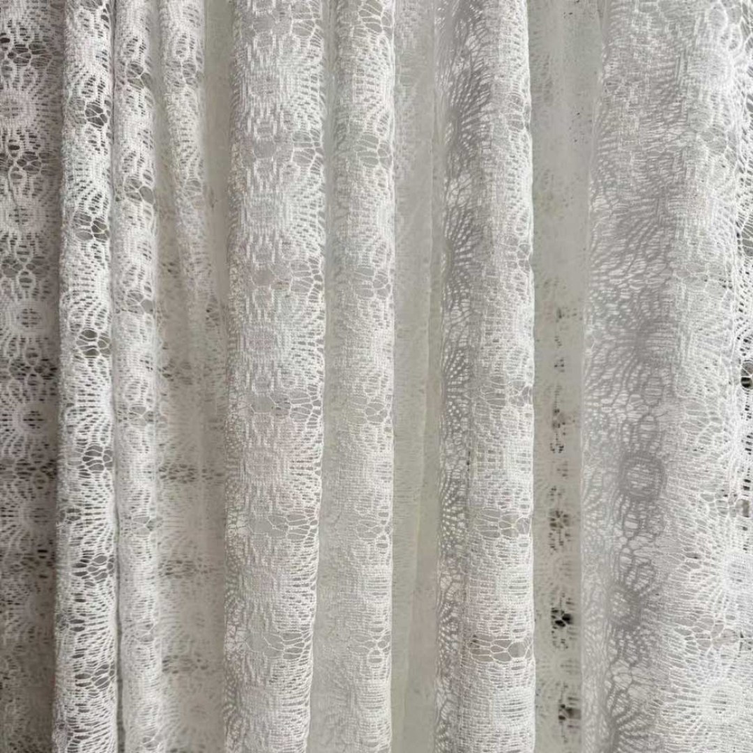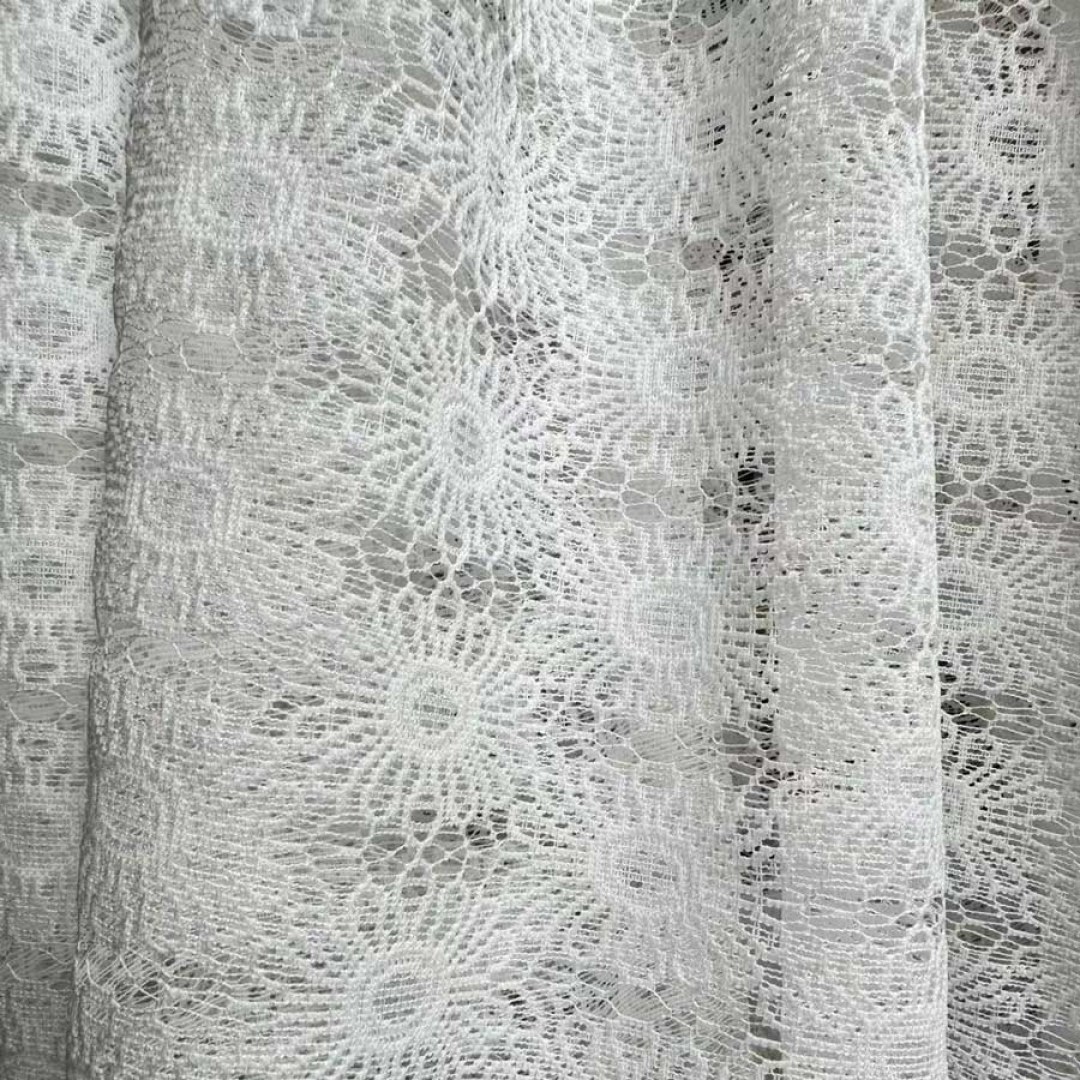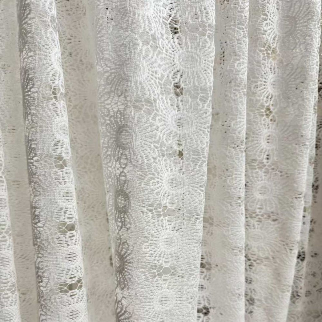 Dieser Spitzennetz-Schleierstoff zeichnet sich durch ein sich wiederholendes Sonnenblumen-inspiriertes Muster mit kreisförmigen Blumenmotiven und filigranem Zierwerk aus, das einen zarten und dekorativen Look bietet.