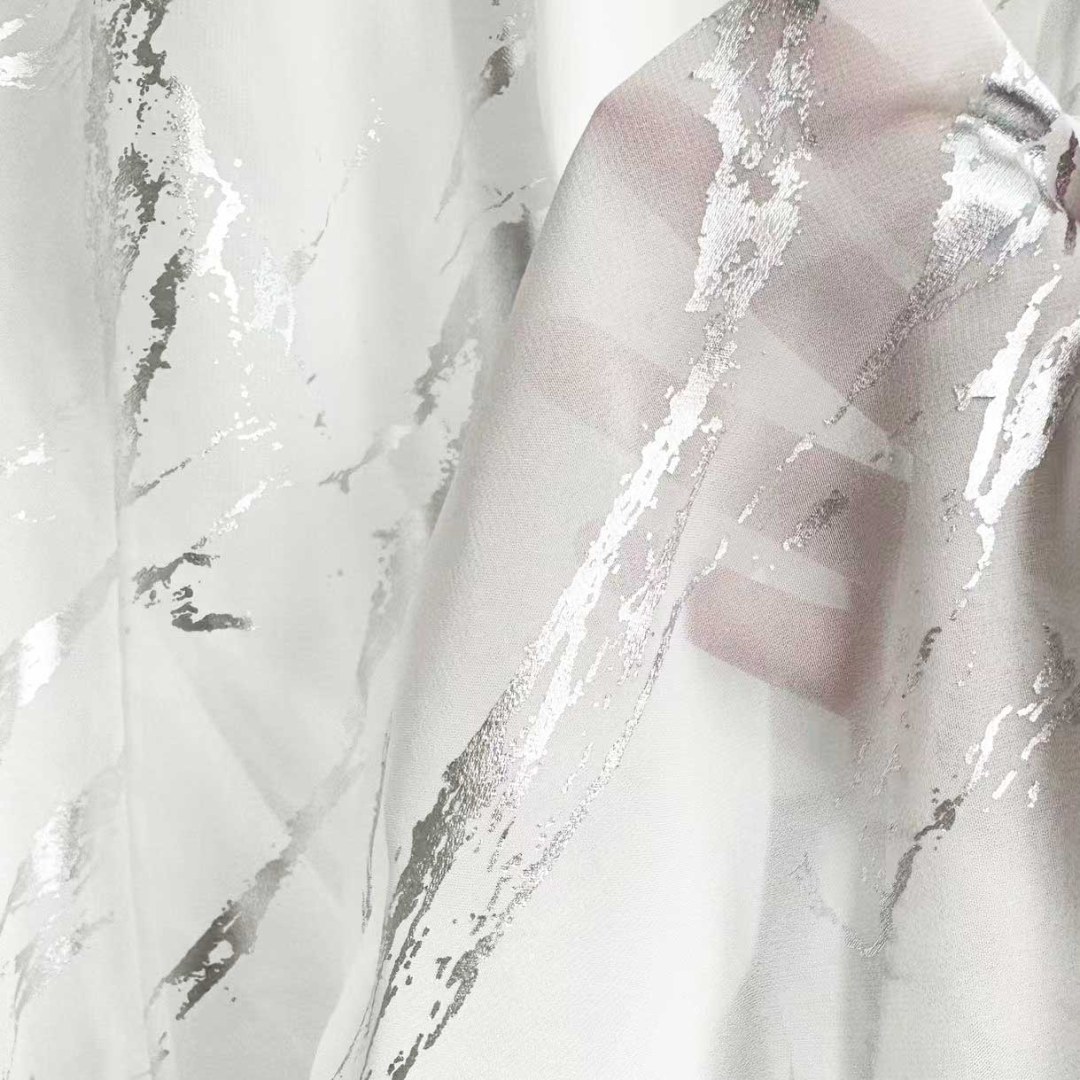 Ein traumhaft leichter Stoff mit wirbelnden Silbertexturen, der die Eleganz von mondbeschienenem Marmor widerspiegelt.