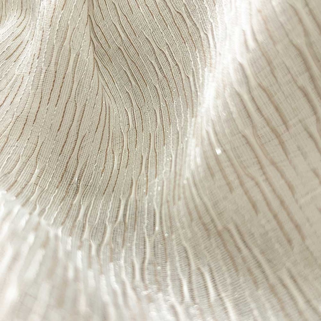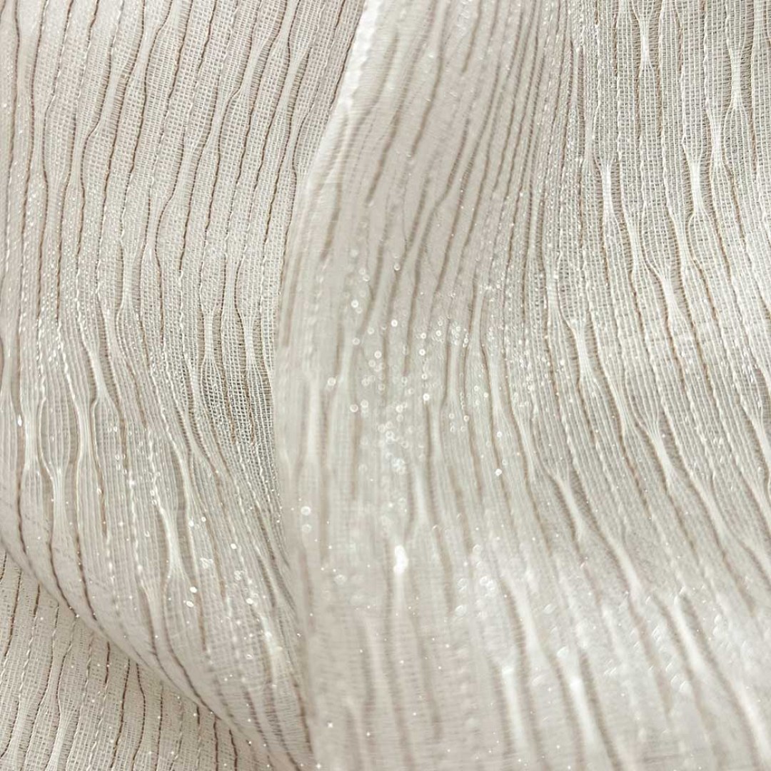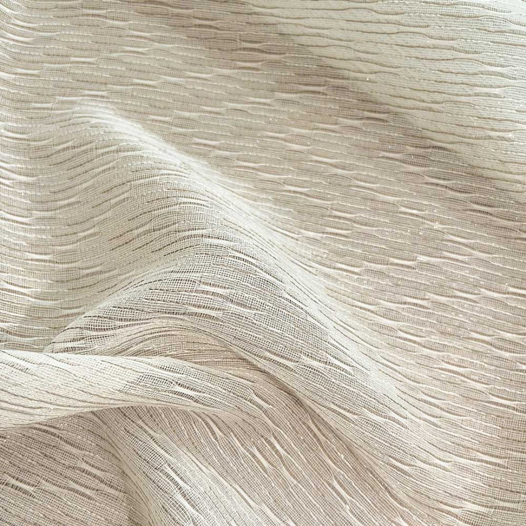 Zarter Voileschleier zeichnet sich durch eine feine Wellenstruktur und einen perlmuttartigen Schimmer aus, der das Licht wunderschön einfängt und jedem Raum Eleganz und sanfte Bewegung verleiht.