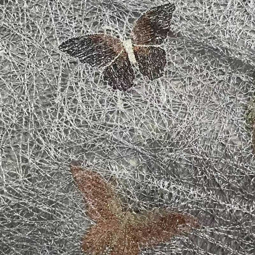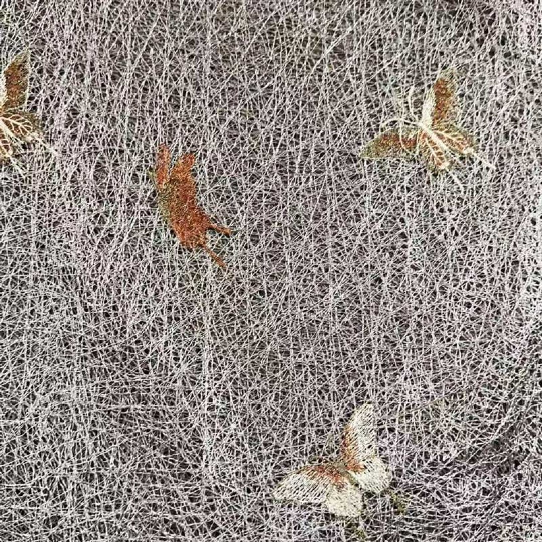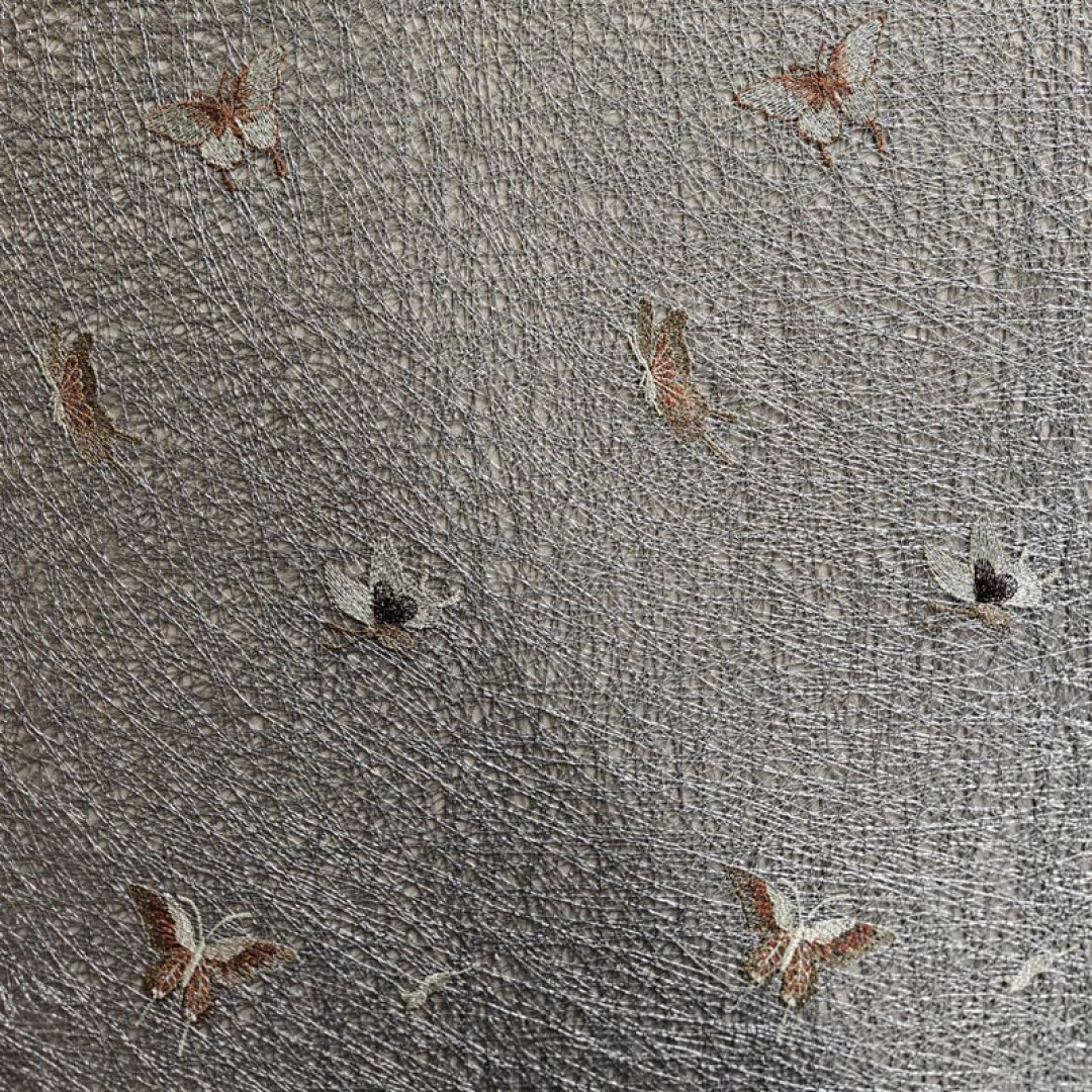 Ein zeitgenössischer Mesh-Gardinenstoff mit zart bestickten Schmetterlingen und goldenen Glitzerakzenten. Das luftige Gewebe und die schimmernden Details verleihen einen verspielten, aber eleganten Charme, ideal um modernen Innenräumen Leichtigkeit, Textur und einen Hauch von Glanz zu verleihen.