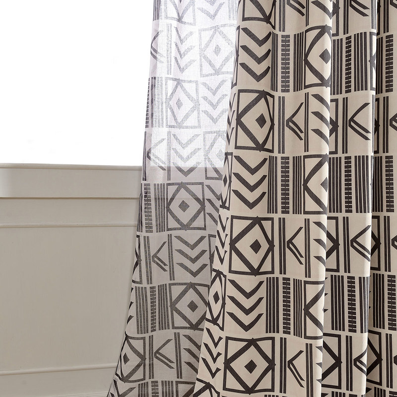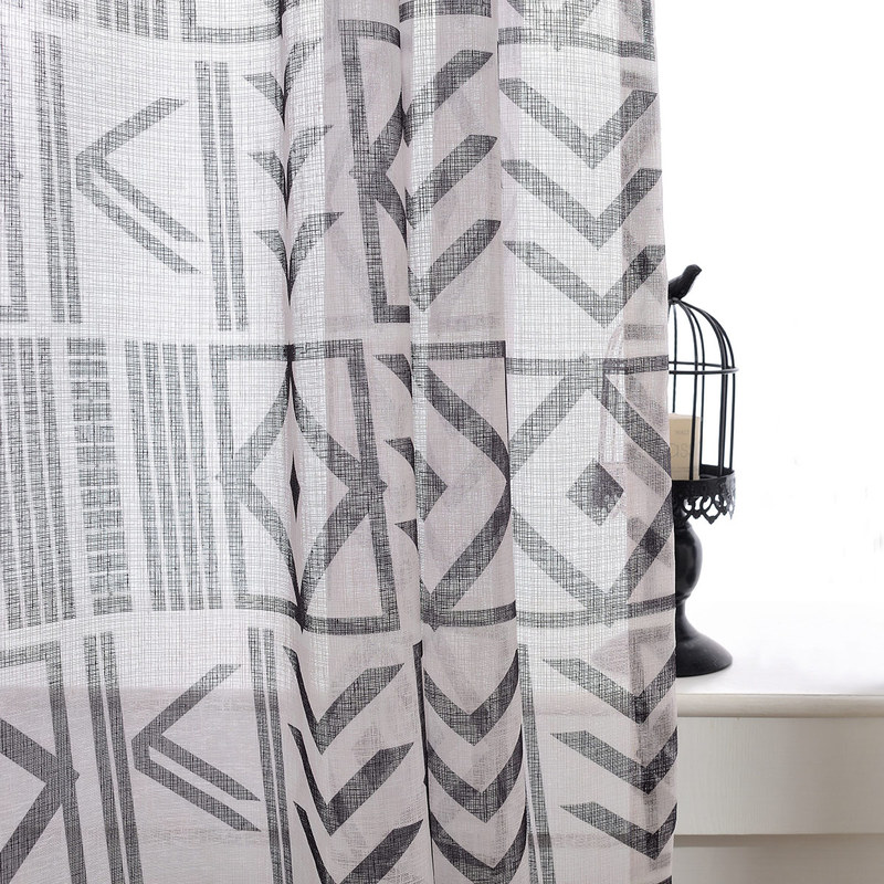 Der geometrische Voile-Vorhang hier heißt "The City Sketch" und basiert auf einem komplizierten und wunderschönen Muster. Er eignet sich besonders gut für ein modernes Interieur und schlägt eine Brücke zwischen Vintage- und Modernelementen.