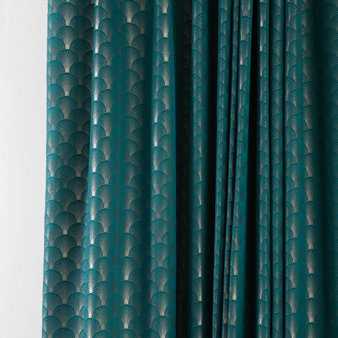 These luxurious jacquard curtains showcase an elegant Art Deco-inspired fan motif, intricately woven to create a textured, dimensional effect.