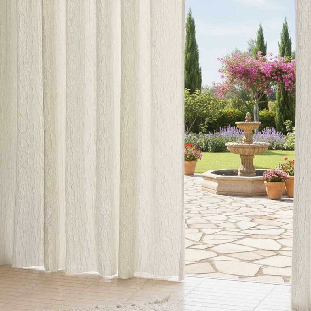 Crushed Drift features a naturally wrinkled linen texture that softens incoming light, creating a warm, airy atmosphere. Its gentle draped movement and organic surface pattern add quiet elegance to any space, pairing beautifully with country, farmhouse, and zen interiors.