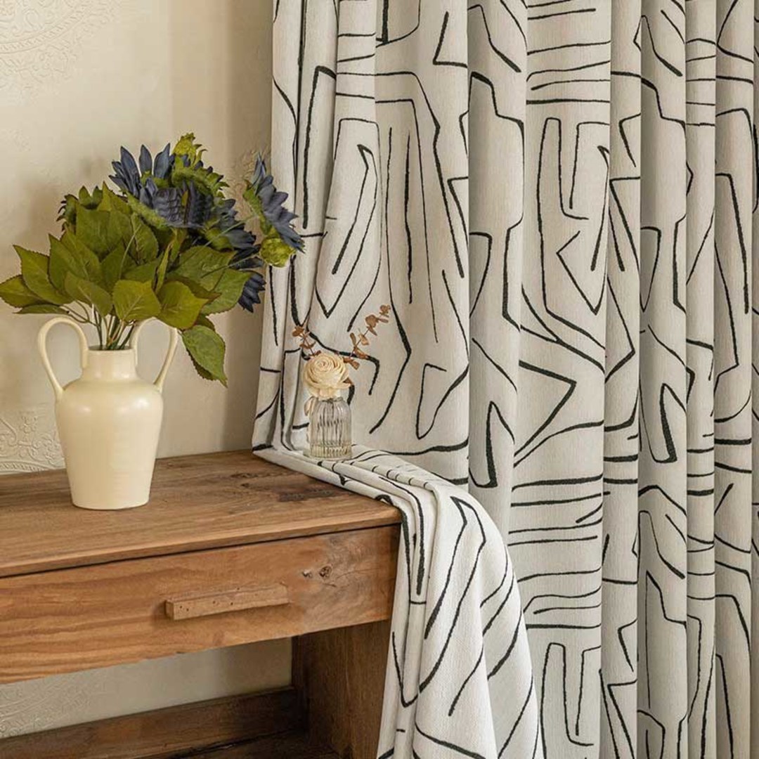 Réalisés à partir de chenille de haute qualité, ces rideaux modernes noirs et blancs à motifs de graffitis linéaires présentent une texture élégante, un poids conséquent et une douceur agréable.