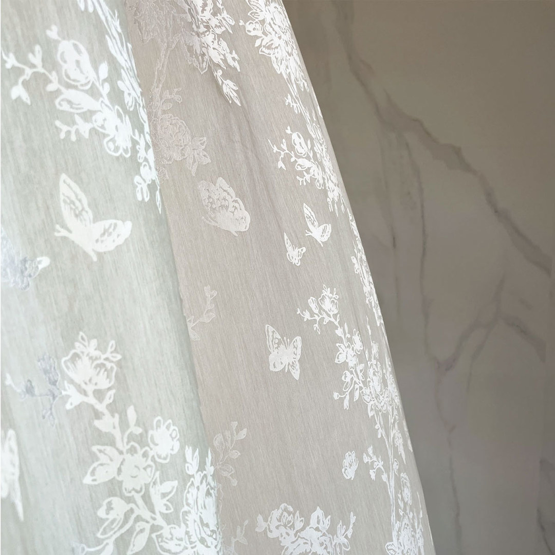 Ce tissu voilé unique présente un élégant motif floral avec des détails complexes de roses, de branches et de papillons. Le tissu semi-transparent filtre délicatement la lumière tout en ajoutant une touche florale gracieuse, idéale pour les intérieurs classiques et aérés.