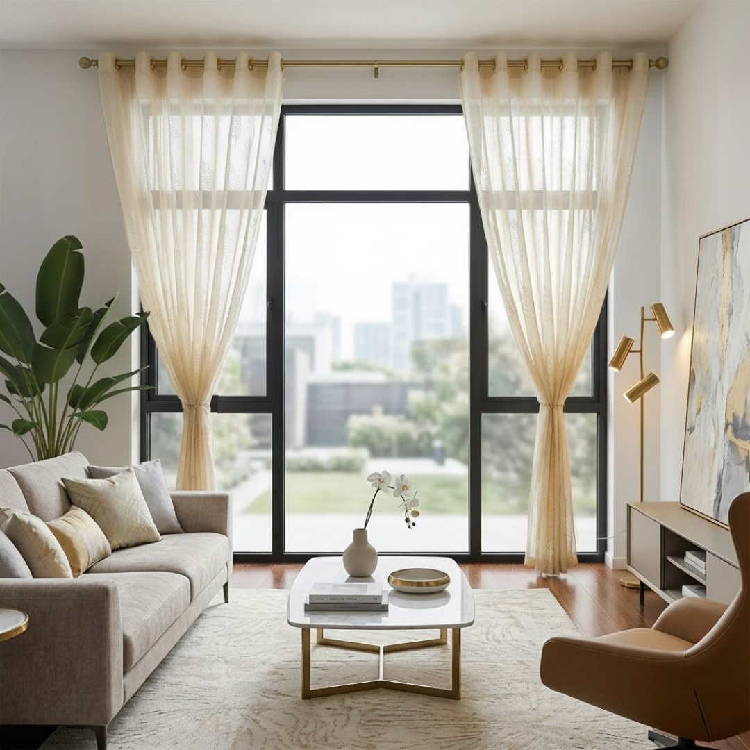 We can source materials and create bespoke designs tailored to your needs: Specific fabrics, decorative finishes, curtain tops and heading styles, and custom-shaped windows.