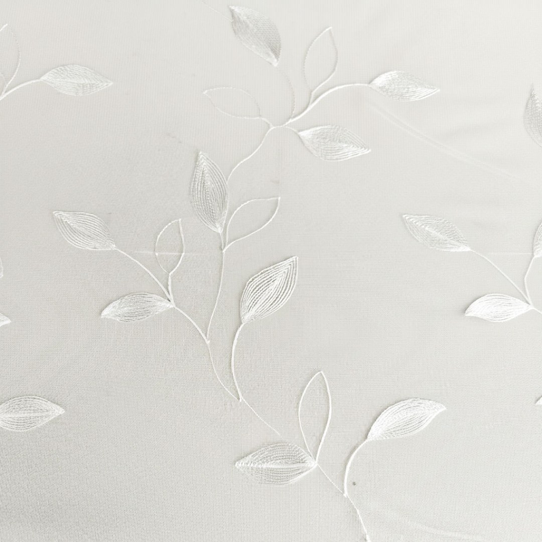 La broderie complexe en forme de feuilles grimpe avec élégance sur un tissu en voile ivoire doux, créant une élégance naturelle. Lorsque la lumière du soleil filtre doucement à travers, un jeu d'ombres et de lumière sublime le motif éthéré. Les détails subtils des feuilles brodées ajoutent une touche fantaisiste et enchanteresse. Sublimez votre intérieur avec simplicité et sophistication.