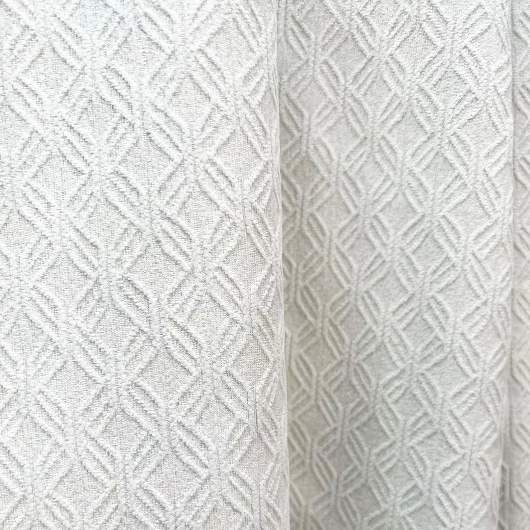 This soft chenille fabric features a textured geometric pattern with an interlocking diamond design. The fabric's pattern adds a touch of elegance and sophistication. The chenille material is known for its softness and luxurious feel, providing both comfort and style to any space.