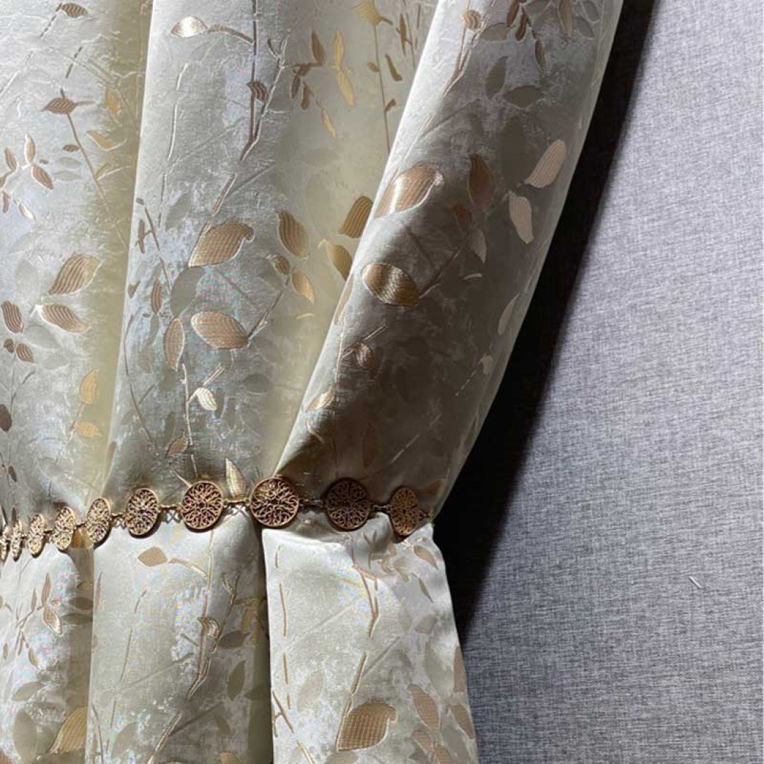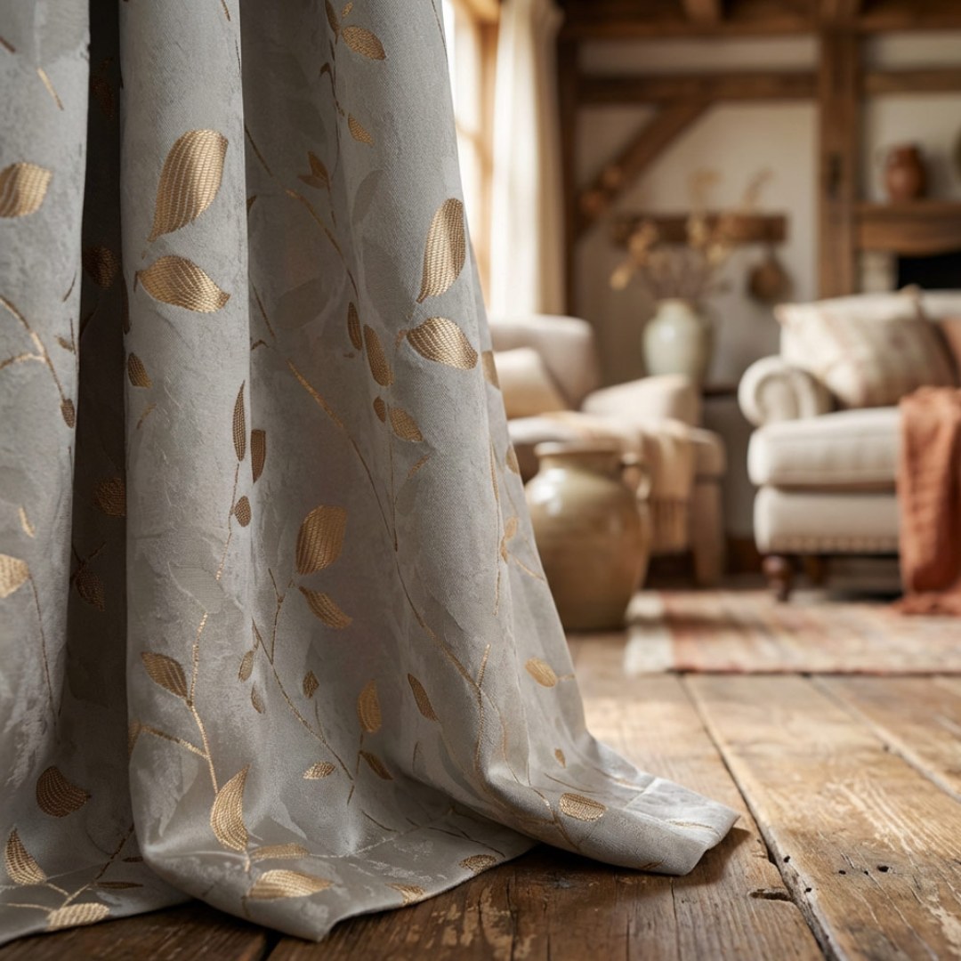 Luxuriously woven in jacquard, these curtains showcase an elegant floral design accented with subtle metallic gold highlights. The refined texture and modern color palettes create a sophisticated, contemporary look, perfect for adding depth, warmth, and a touch of glamour to any interior.